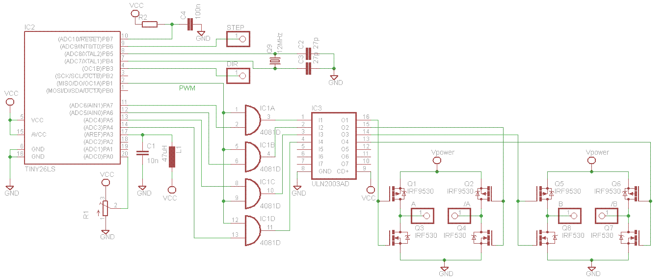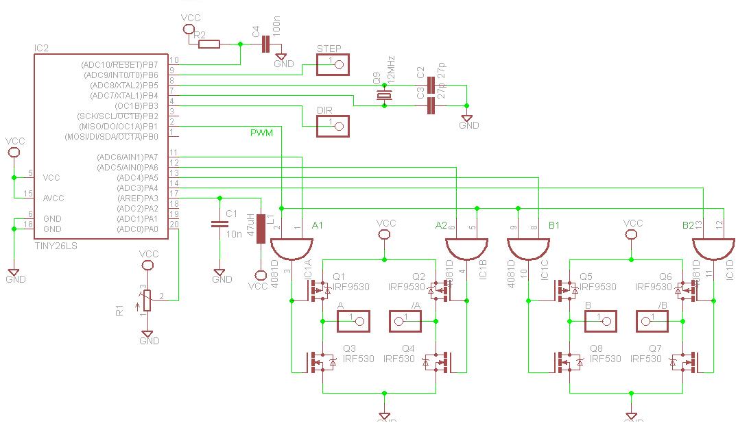 tak po dlhsom case som sa zase vratil k vyvoju bipolarneho driveru. Upravil som schemu zapojenia. Na obrazku este nie je kozmetika ku procesoru cize oscilator a pobobne drobnosti. Frekvencia oscilatora by mala byt 16MHz(1 SC za 10ns) frekvenciu PWM by som volil okolo 16Khz, generujem ju na vystupe 16bitoveho c/c (OC1A,OC1B).