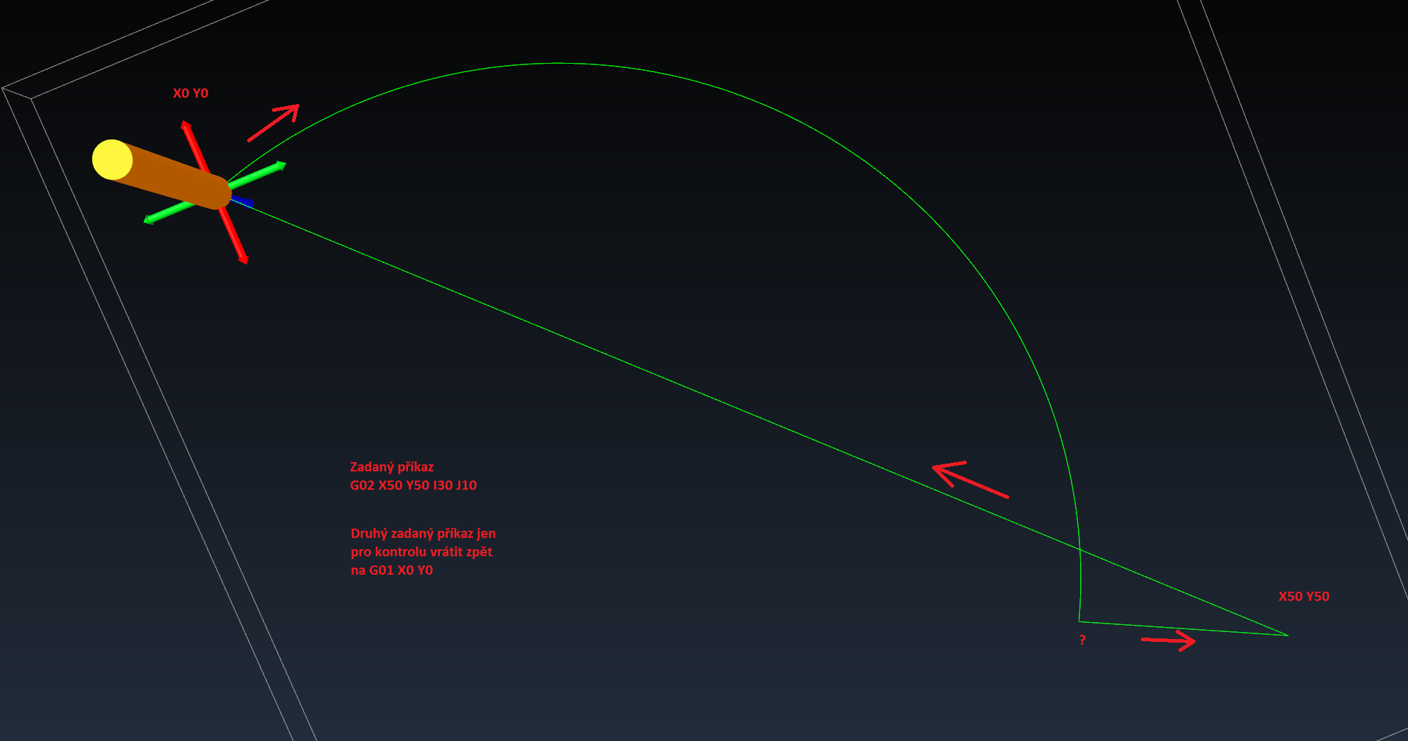 Když to řeknu ještě takto jak přišel simulátor na to že má jet ještě x bodů pod přímku vždyť příkazem X50 Y50 I30 J10 neudávám zvlášt délku oblouku ale jen rádius daný I a J takže by měl automaticky končit na té přímce ne?
