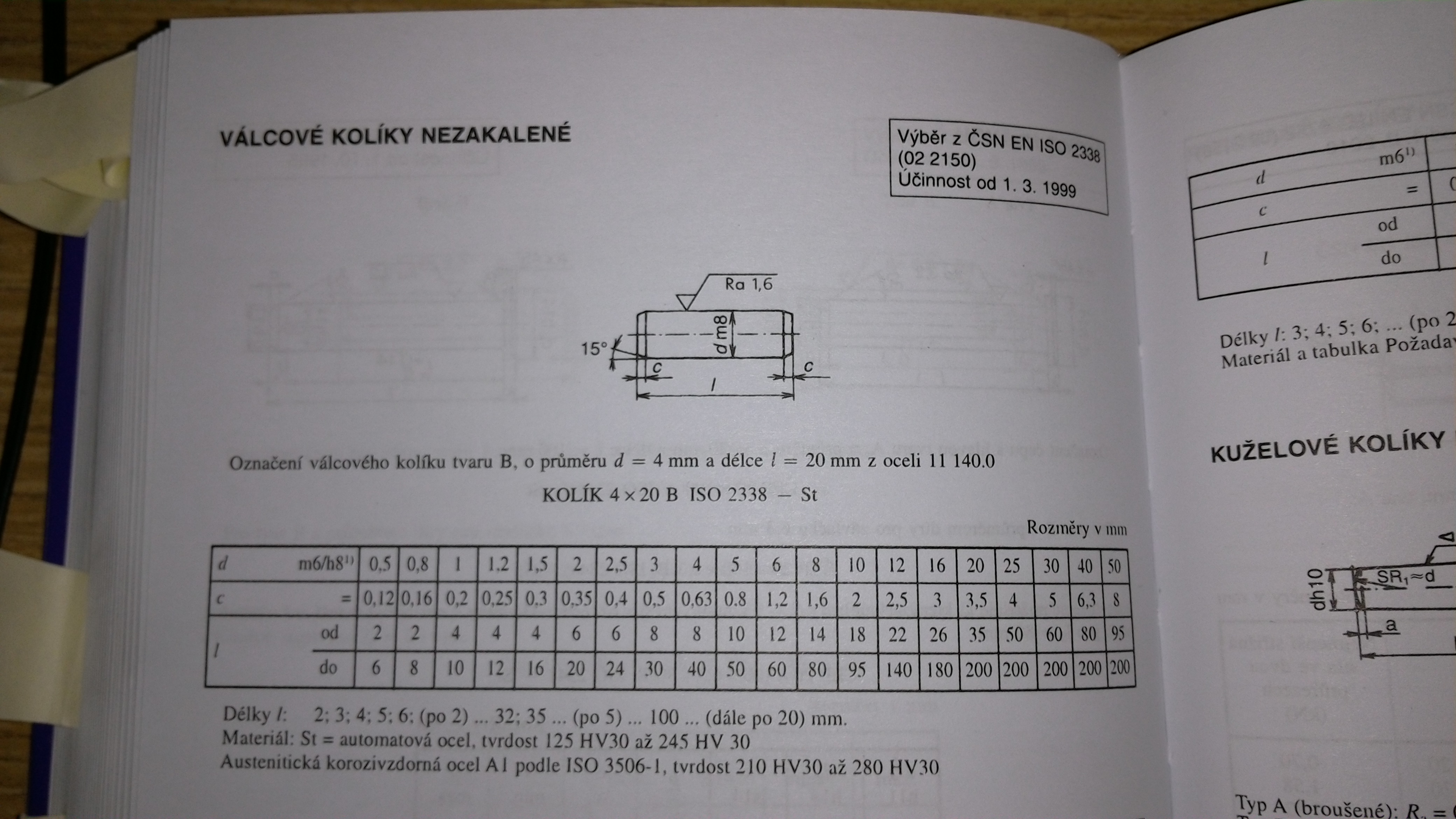 Pěkný večer, měkké kolíky se dělaly z automatovky 11 107, po jejím zrušení z 11 109 (ekv. 1.0715) a z 11600 (1.006). Podle ČSN 02 2150 se materiál rozlišoval doplňkovou číslicí 1- 11 109, 2- 11 600. Kolíky k roznýtování se dělally z 11 423 (1.004), ale to je norma 02 2140 a kalené ČSN 022152 ze stříbrnky 19 421 (1.221)