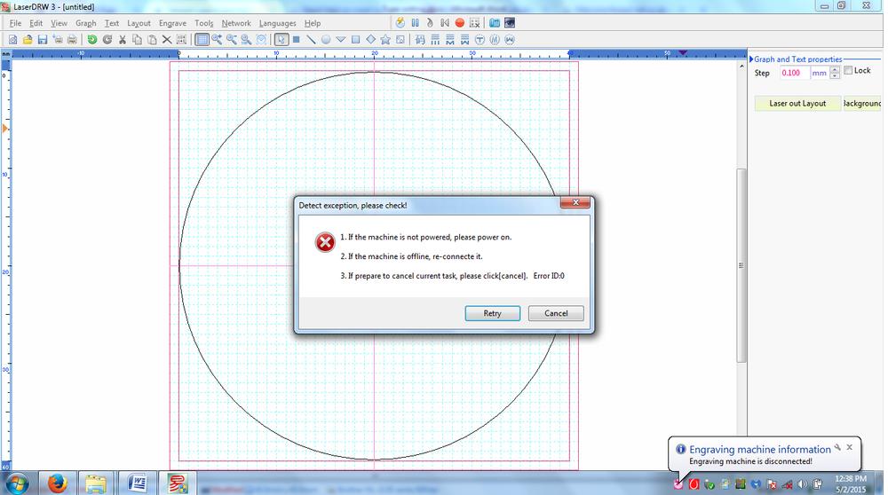 A řeč je předpokládám o tomto laseru? Za jakejch okolností se ta hláška objevuje (pokaždý asi ne, když jsi schopen i dát něco vygravírovat)? Jestli to správně chápu, komunikuje to přes USB. Zkoušels jinej USB kabel, port případně jinej počítač? Tlačítko TEST je kde, na stroji nebo taky v tom programu?