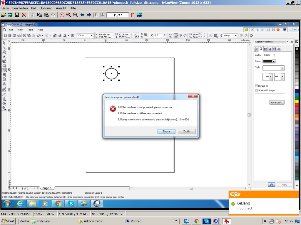 já nevím - ale hláška na počítači v překladu "pokud stroj není zapnut tak jej zapni" mi napovídá, že PC/ovládací program prostě ten stroj nevidí