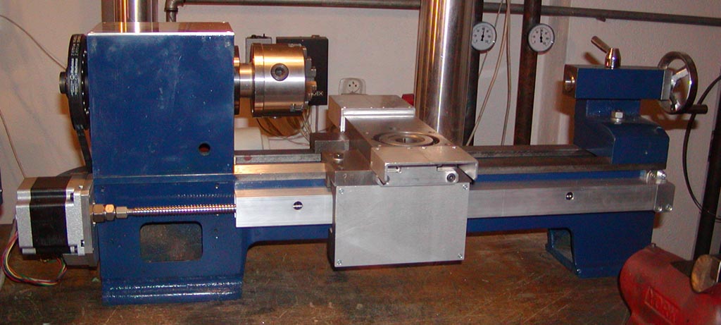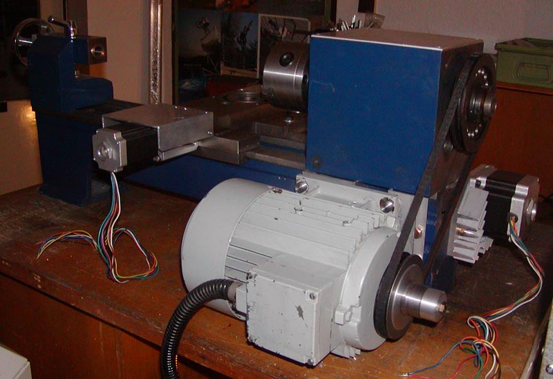 Vzhledem k tomu, že je to tu skoro samá portálová frézka, dovolím si pochlubit se s něčím trochu jiným - stavím CNC soustruh. Základ je číňan z Globusu, značka Asist, cena 17000 Kč (před rokem), v podstatě je to Proma SPA-500. Komplet jsem to vykuchal, zbylo v podstatě jen železo. Pohon jsem dal 2-rychlostní 3-fáz 0,75 kW 1400/720 ot/min, měnič bude Hitachi SJ200, ohulím to na 80 Hz. Krokové motory Microcon, Z = 4 Nm, X=2,5 Nm. Kuličkové šrouby válcované Hiwin 12x4, natvrdo ke krokáčům. Elektroniku jsem koupil komplet na www.jmf.cz Peněz nemálo, ale když tomu nerozumím, tak je to pro mě super řešení - připojím 230V, krokáče, LPT přes nějaký budiče a jedu. Software si píšu sám (to zas bude komentářů proč nejdu do Machu :=). Je to moje prvotina, takže mě kdyžtak šetřete! Petr