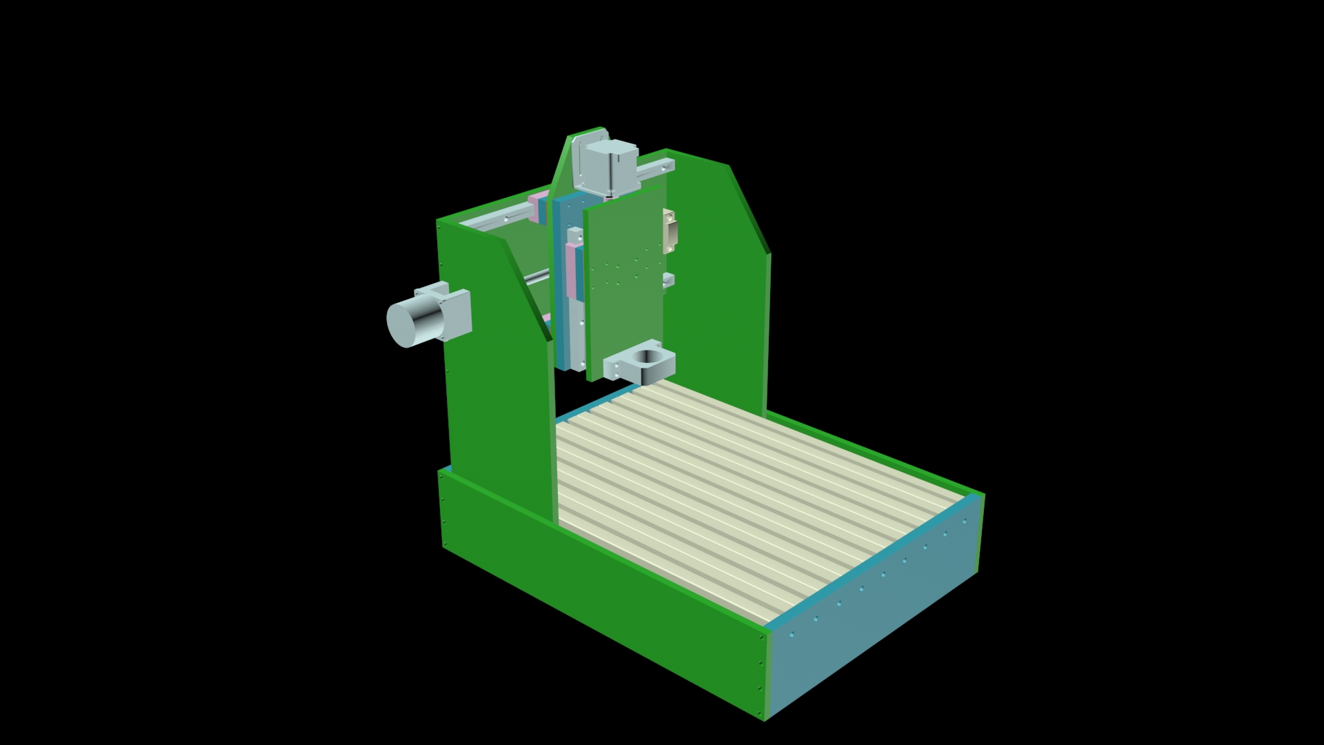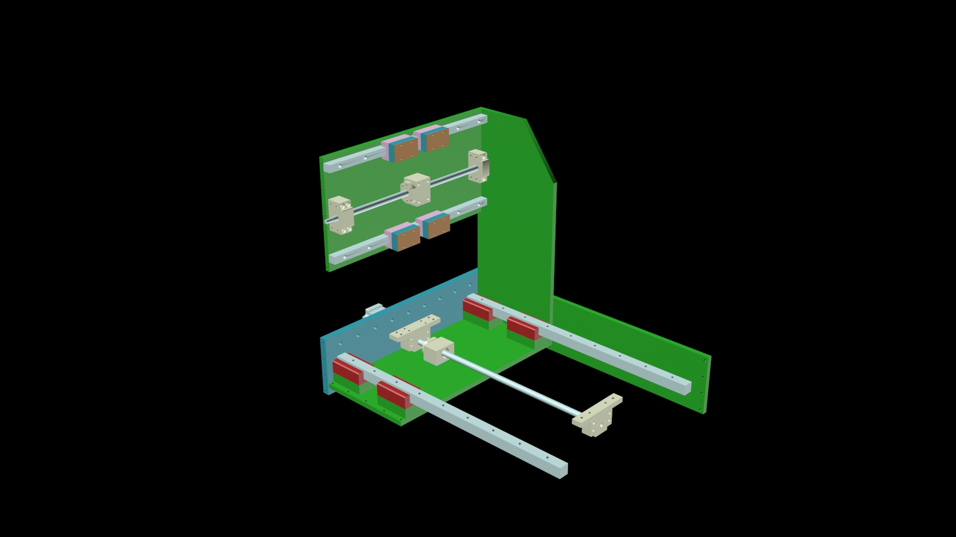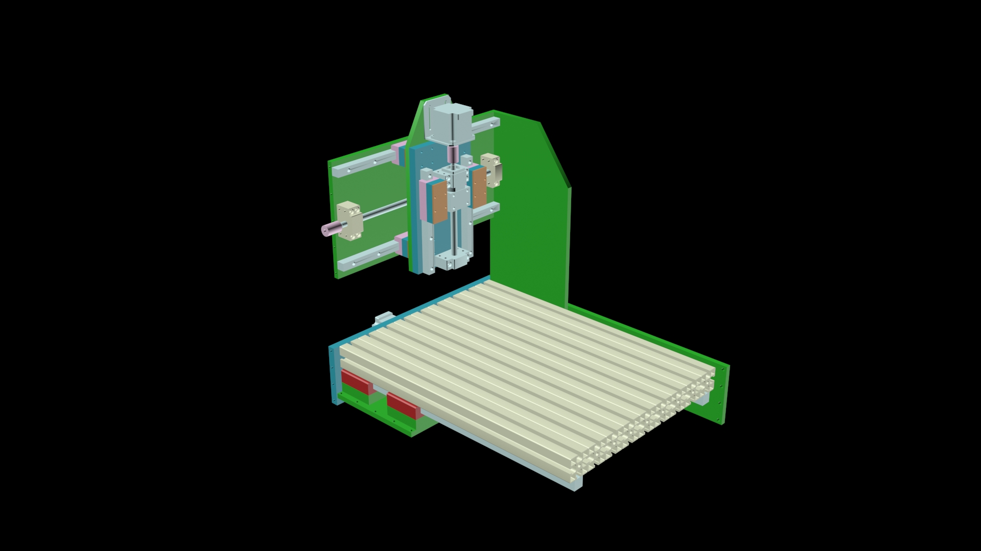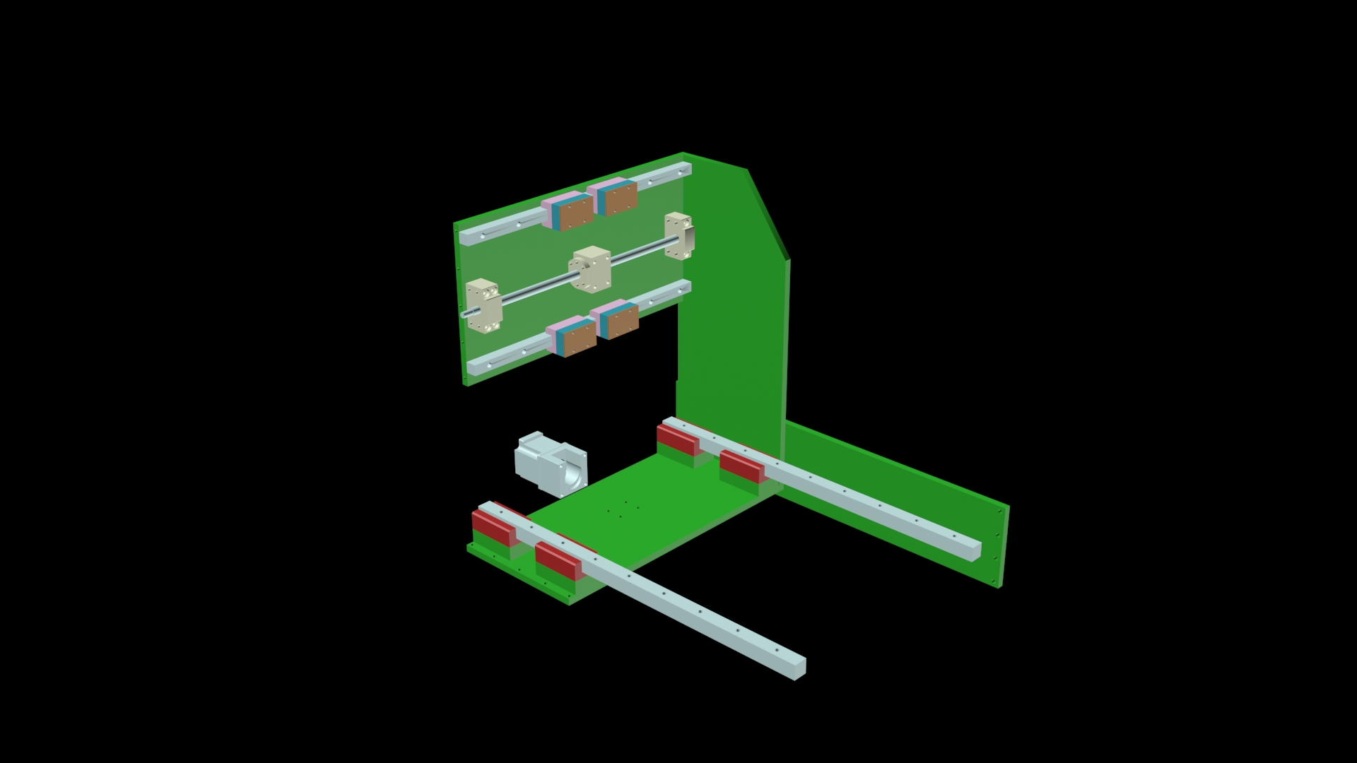 Hlavní účel tohoto stroje by byl frézování mědi z desek plošných spojů, popř. po výměně "nástroje" za tiskovou hlavu i 3D tisk. Tisk jako takový by nejspíše nebyl na tuhost stroje náročný, nicméně pro potřeby frézování DPS je samozřejmě vyžadována přesnost a tuhost stroje. Zda-li by mnou navržené řešení bylo dostatečně tuhé a přesné, to nechám na posouzení vás. Snažil jsem se svůj návrh tak nějak vypotit v 3DStudiu Max, přiložím jej na konci příspěvku.