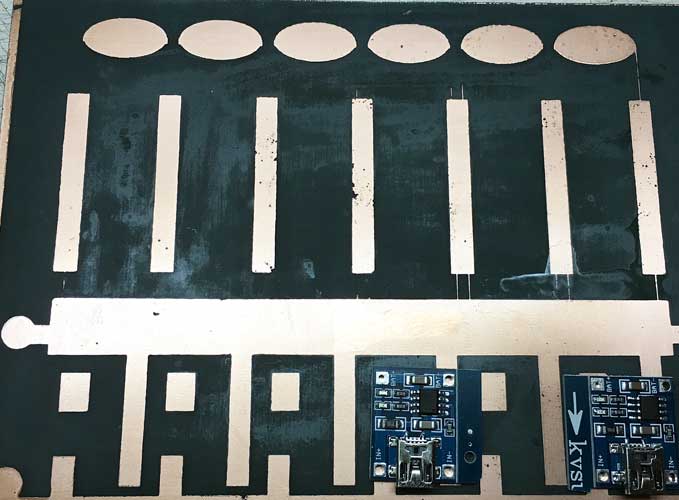 Nejdřív jsem je nabíjel proudovým zdrojem na 4V, ale pak jsem na aukru koupil prťavou destičku s chytrým obvodem na nabíjení. Nekupte to za tři pětky kousek. A tak jsem se rozhodnul že udělám nabíječku. Jako zdroj 5ti voltů jsem použil PC-zdroj a rovnou na něj, že nabastlím na kousek plexi ty destičky. Ale ouha, držák na 18650 stojí jak půlka baterky. Tak tedy pěkně postaru udělat chlívečky z plošňáku a když už plošňák, tak ať jsou tam alespoň nějaké spoje. Celá výroba spočívala v nastříkání kousku destičky acetonovou barvou na auto a odgravírování nepotřebných ploch laserem. Překvapivě barva shoří, ale zůstane po ní takovej povlak, kterej jsem nakonec musel očistit pískem na nádobí a pak bylo vše ok. Leptáno peroxidem se solnou. Na závěr lze říci, na "vážné" užití to není, na nějakou takovou "indistriální" rychlovku je to použitelné, protože celá výroba trvala max. 20 minut.