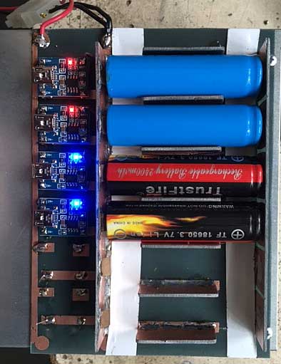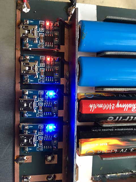 Bronzovej plech jsem našel, pár hodin jsem místo práce fušoval a mašinka funguje. Škoda, že jsem se k tomu nedostal dřív, vypadá to fakt dobře. Protože mám ty nabíjecí destičky jenom čtyři, tak jsem pro jistotu objednal další, aby dodělal nabíječku kompletně. Levé dvě baterky se nabíjejí, pravé už jsou OK.