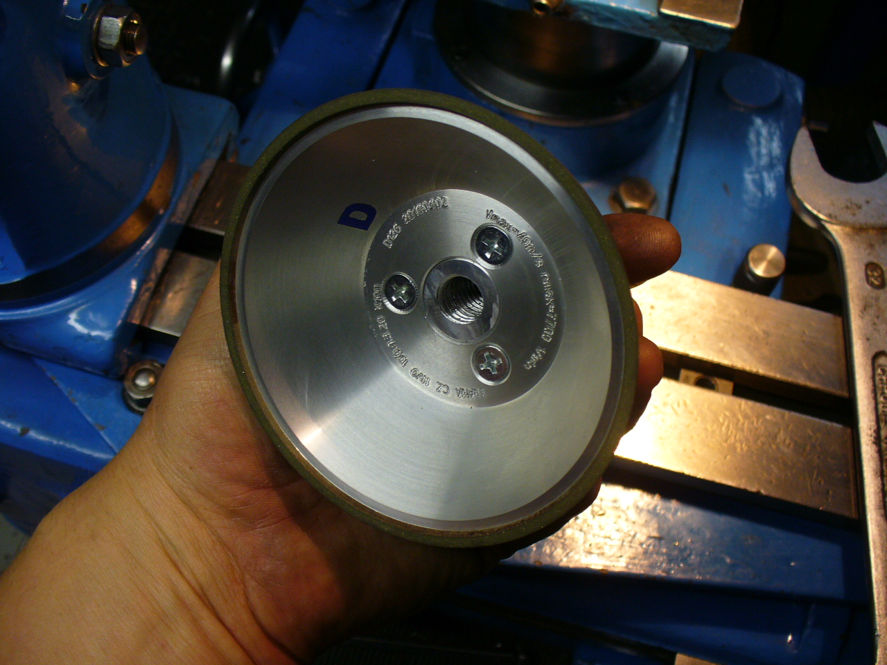 jeden mám taky, nic na tom není žádné označení, zrnitost mi přijde jako hodně hrubá 160 a výš, berou dobře, pokud to má někdo na doma na dvoukotoučovku tak za ty prachy asi nebude zklamaný, ovšem chce to úpravu, kotouče co jsem měl já hází, tzn, přední brusná plocha není rovná, ale v jednom místě je propadlá, na rovnou desku se dá nějaký hrubší šmirgl a pomalu krouživými pohyby se to musí srovnat, ideál ještě pod vodou, pak nějakým jemnějším, no a po této operaci se musí obrousit, nebo osoustružit zadní čelní dosedací plocha.