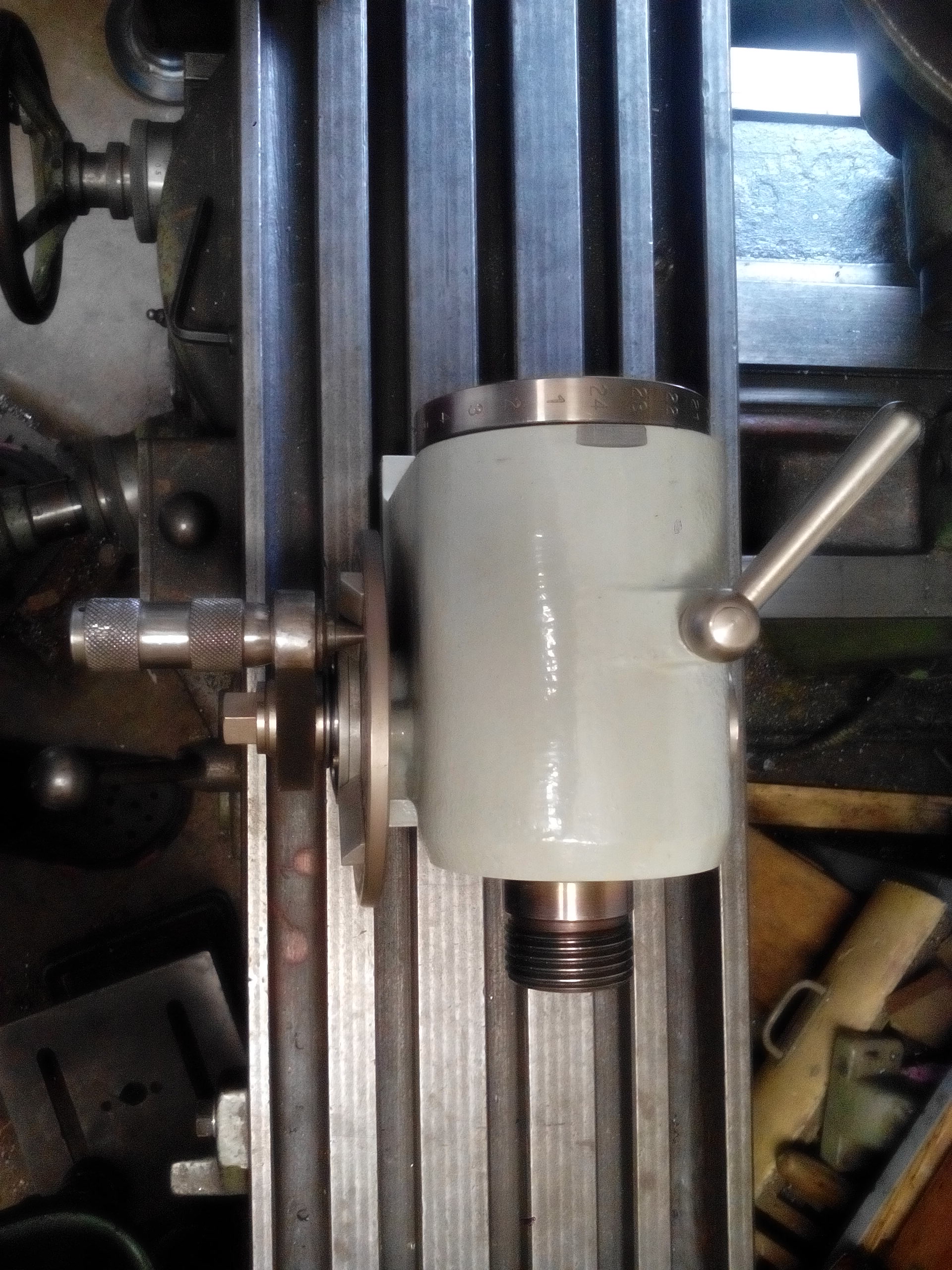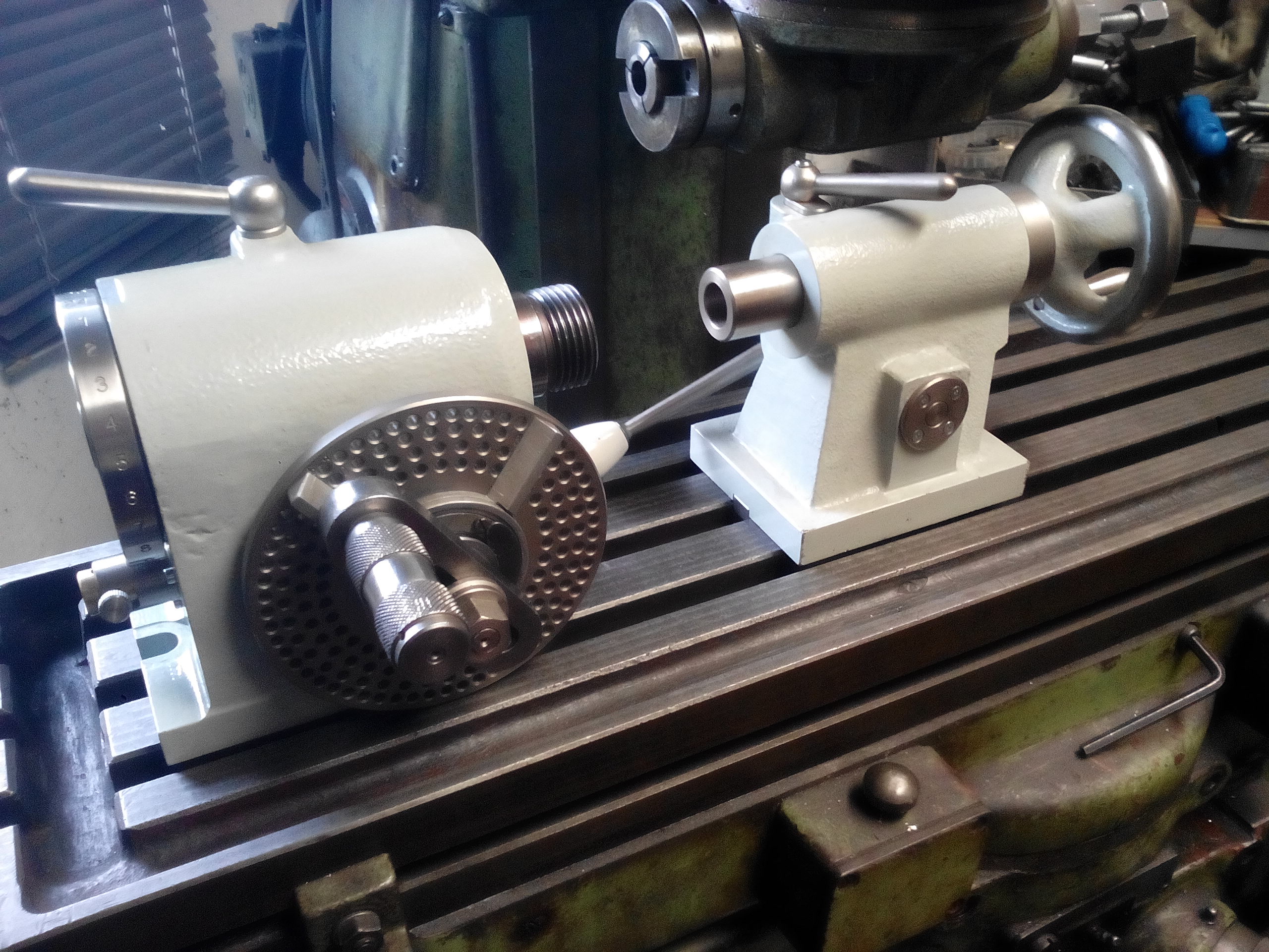 Tak jsem dodělal děličku s koníkem k mojí malé gravírce. Odlitky vlastní včetně návrhu a výroby modelů, jen šnekové kolo jsem si nechal vyrobit a dírkované kotouče, ručičky a klička jsou použity ze starého otočného stolu. Vřeteno a pinola jsou kalené, ostatní díly niklované a zbytek v barvě. Výška od základny je 110mm, vřeteno má závit jako můj malý soustruh, abych mohl používat příslušenství, které mám, vnitřní kužel ISO30. Výsuv pinoly cca 55 mm a má morse2.