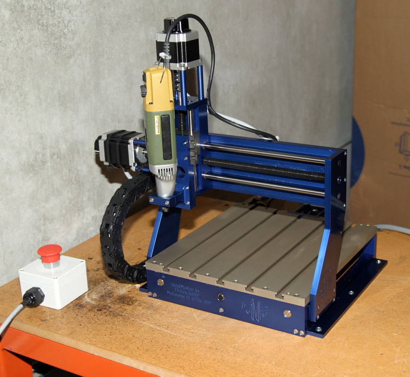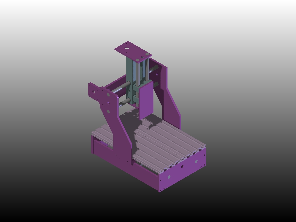 Základna stroje má dispozici 350x240x450mm, rozjezdy jsou 260x160x120mm, většina dílů je koncipována jako výpalek z laseru a tloušťky se pohybují 5-10mm, vodící tyče jsou průměru 14mm a závitové trapézové šrouby 14x4mm matice budou mosazné a mohou mít délku X-50mm Y-30mm Z-30mm, kluzná vodící pouzdra jsou bronzová s výstelkou. Uložení kluzných ložisek bude ve frézovaných a potom svrtaných pásovinách 20x30mm, kdy na konci budou dokončena patřičným výstružníkem pro nalisování pouzder. Vřeteno bude vysokootáčkové 5000-30000 ot/min, popřípadě výměněné za obyčejnou vrtačku v případě nějakého hrubování. Postupem času bude celá konstrukce doplněna a vřeteno pro možnost soustružení, bude umístněna vzadu za strojem a bude mít možnost pohonu buď motorem s regulací, nebo připojením krokového motoru přes šnekový převod pro výrobů třeba pastorků atd.