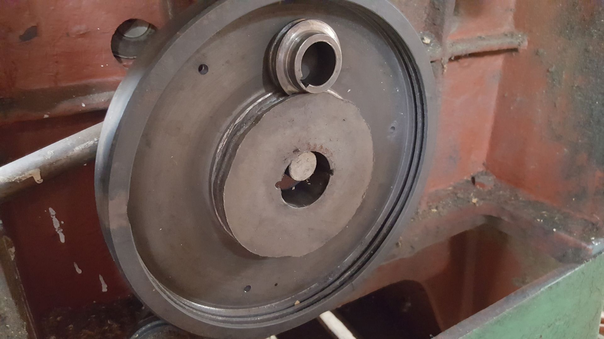 Nevím jestli toto řešení je od výrobce, nebo to už někdo bastlil, ale evidentně to není úplně vhodné. ( Kolo nejsou válcovitá, ale téměř hranatá, velké kolo je od pastorku vydřené ( pastorek se otáčel, ale kolo stálo ), kolo je litinové, klínovým profilem na kole vznikly slabé stěny, které jsou již vylámané, styk želežo-železo ).