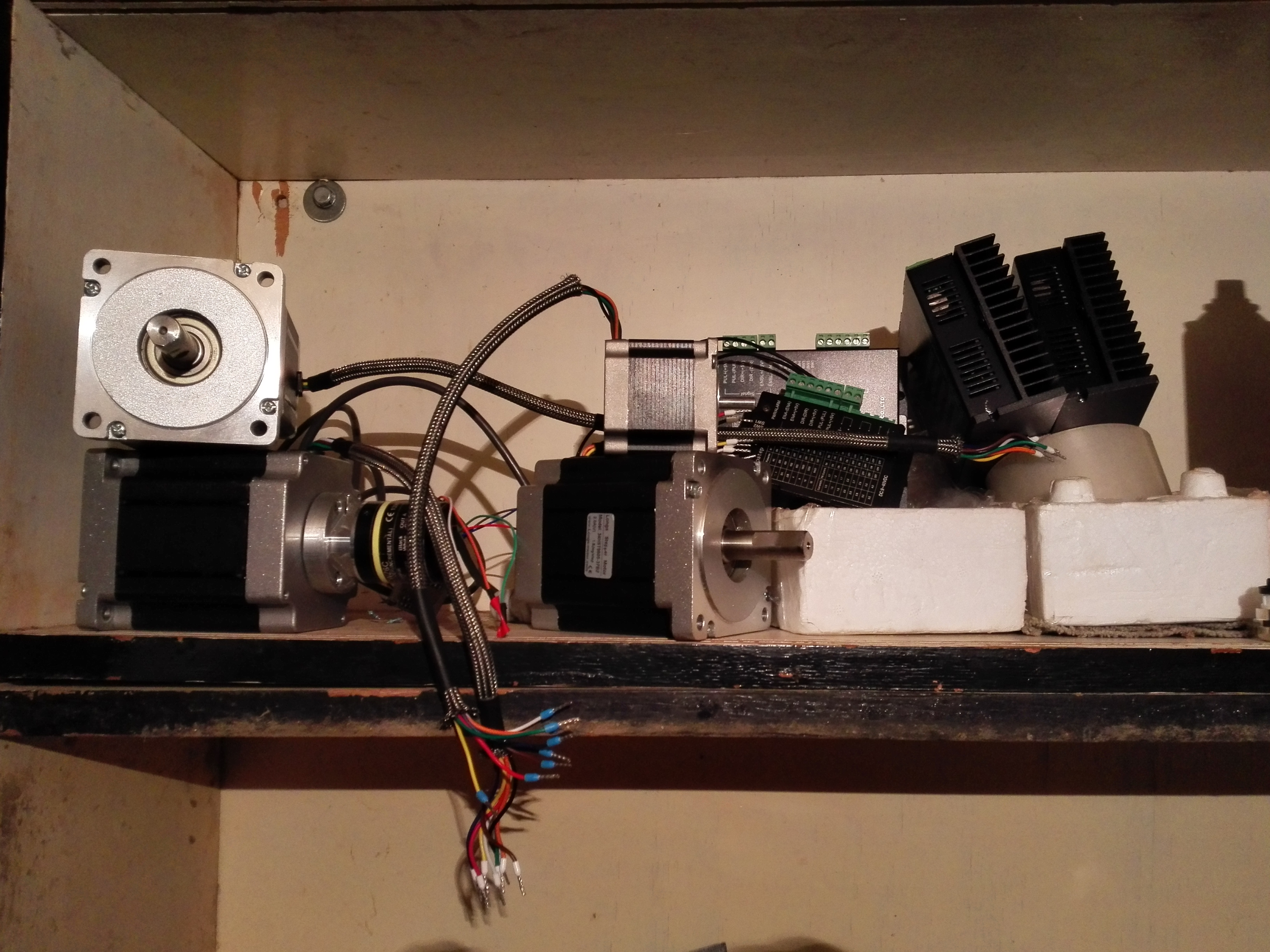 S pôvodným osadením pohonov som mal mierny problém. Osi sa síce hýbali, dokázali to dokonca s dobrým zrýchlením (1000 mm2/min), a rýchlosťou (4000mm/min), ale obrovský problém boli rezonancie KM pri nízkych rýchlostiach a s tým spojené straty kroku. Pri dlhom hľadaní riešenia som uvažoval o rôznych možnostiach, ale všetky som zavrhol. Najprv som myslel, že sa tým oblastiam vyhnem rýchlym prechodom... teda skôr nemyslel ako myslel. Pri pohybe po kružnici sa totiž nedá vyhnúť nízkym posuvom. Zotrvačník nebolo kde dať, a aj keby, tak by som len posunul rezonancie k nižším frekvenciám, takže zas cesta mimo. Znižovanie/zvyšovanie prúdu KM, zmena zapojenia sériovo/paralelne nepomáhalo. Už som bol zúfalý, tak som sa rozhodol pre záplatu. Síce som sa zmieril s rezonanciami, ale stratu kroku som chcel eliminovať zmenou riadenia na closed-loop. Keďže som mal doma 3 kusy 1000 imp/ot enkodérov Omron, tak som si zaumienil upraviť moje motory tak, že dorobím odmeriavanie a dokúpim 1 driver od Leadshine pre closed-loop riadenie. Tak som si požičal peniaze a čakal na driver. Medzičasom som musel dorobiť k enkoderom obvod, ktorý generoval invertovaný signál, keďže moje enkodery boli len open colector.