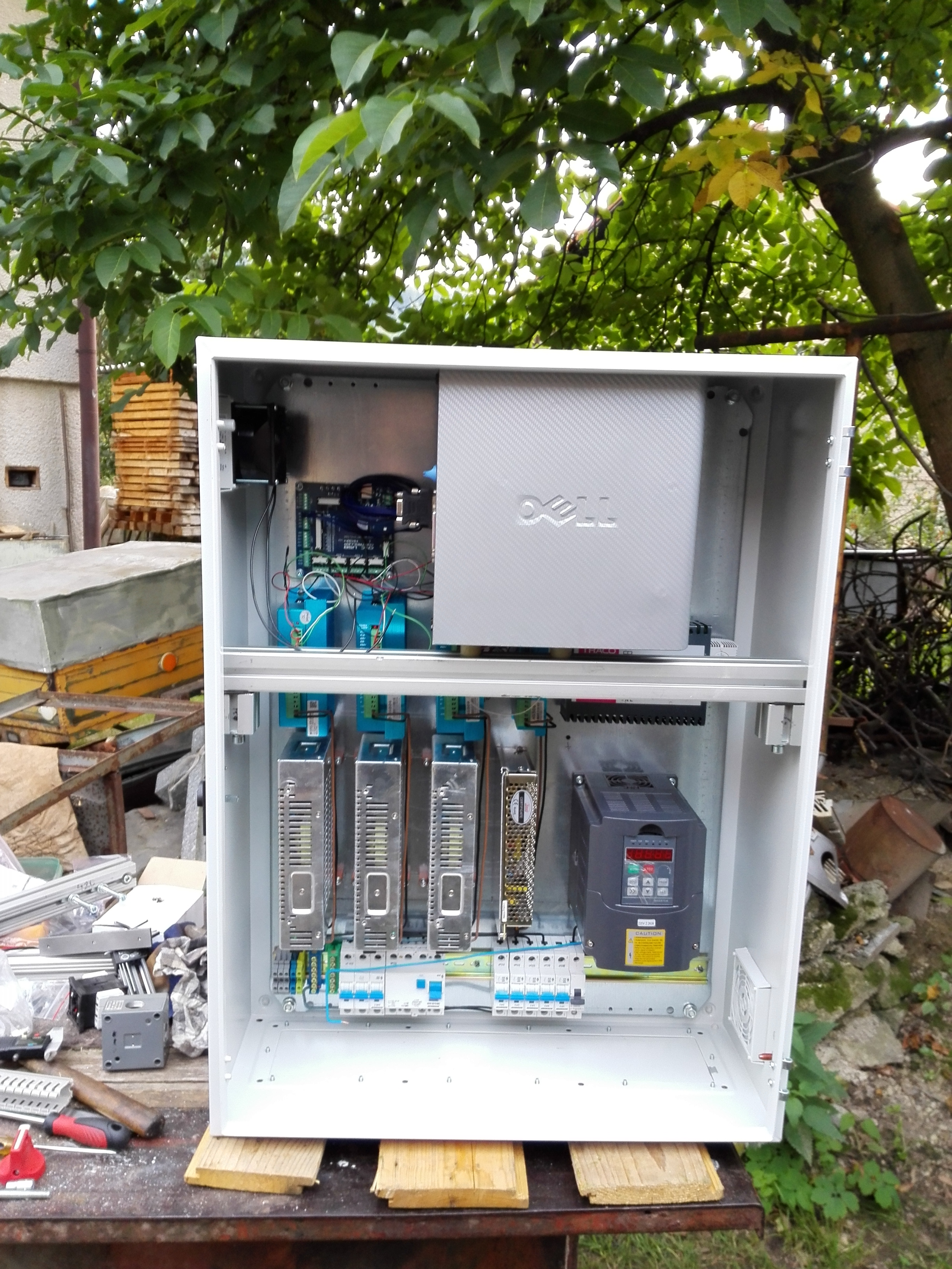 Elektrika v rozvádzači spolu s PC (po krátkom používaní asi ten PC vyberiem z rozvádzača, kvôli rušeniu od meniča). Na foto ešte nieje dokončený. Dnes je v ňom okrem iného aj EMC filter.