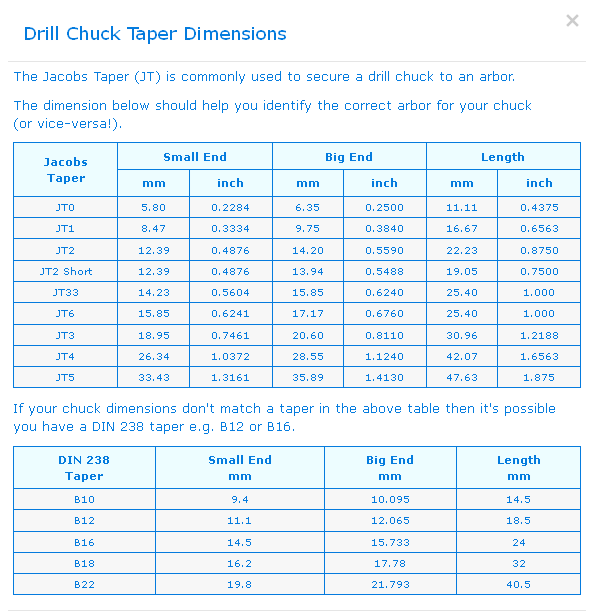 Zde rozměry Jacobs kuželů: Zde zdrojbrutal píše:Jo jo, Jacobs je trochu jiný, u nás jsem ho snad nikdy neviděl, všude ve sklíčidlech mám ten B typ. Ale třeba americká videa na YT jsou těch Jasobsů plná, tak předpokládám že tam tenhle kužel frčí pořád.Zdenek Valter píše:Pozor Jakobs kužel není to co B! Ale máš pravdu je to pro uchycení hlavičekbrutal píše:Podle mne se Jacobs kužel jmenuje krátký kužel např. pro uchycení vrtačkového sklíčidla na trn, byl to předchůdce dnes užívaných B16, B18 apod.