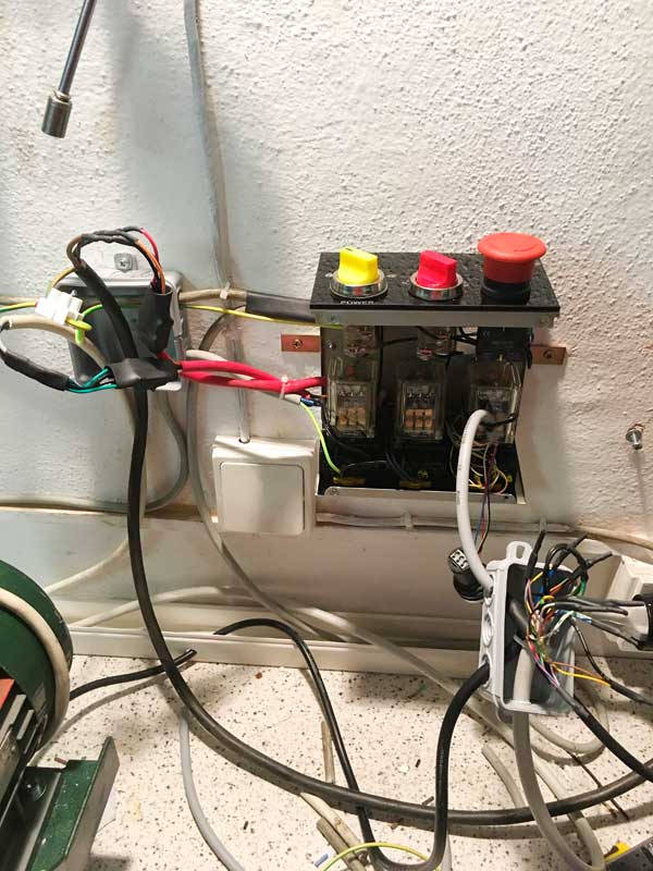Tak jsem zase o kousek dál. Tělo frézky už má přišroubovanou vanu (opět litinový odlitek 35kg). Protože vrtačka i frézka jsou vedle sebe a mají skoro stejné motory, udělal jsem přepínané řízení pro oba stroje.
