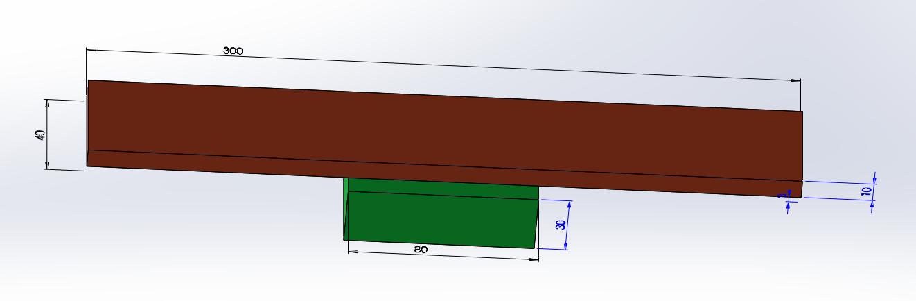 potřebuji pro jednu aplikaci posouvat hnědou desku po zelené kostce jen v jednom směru - zde ve směru koty 40 mm, stačí přímý posuv o 5 mm, nejlépe stavitelný jedním posuvovým šroubem. Snažím se najít nějaké jednoduché řešení které by se víceméně rozměrově vešlo do hmoty těch dvou kusů, bylo výrobně jednoduché a zajistilo tuhost na koncích koty 300 mm.