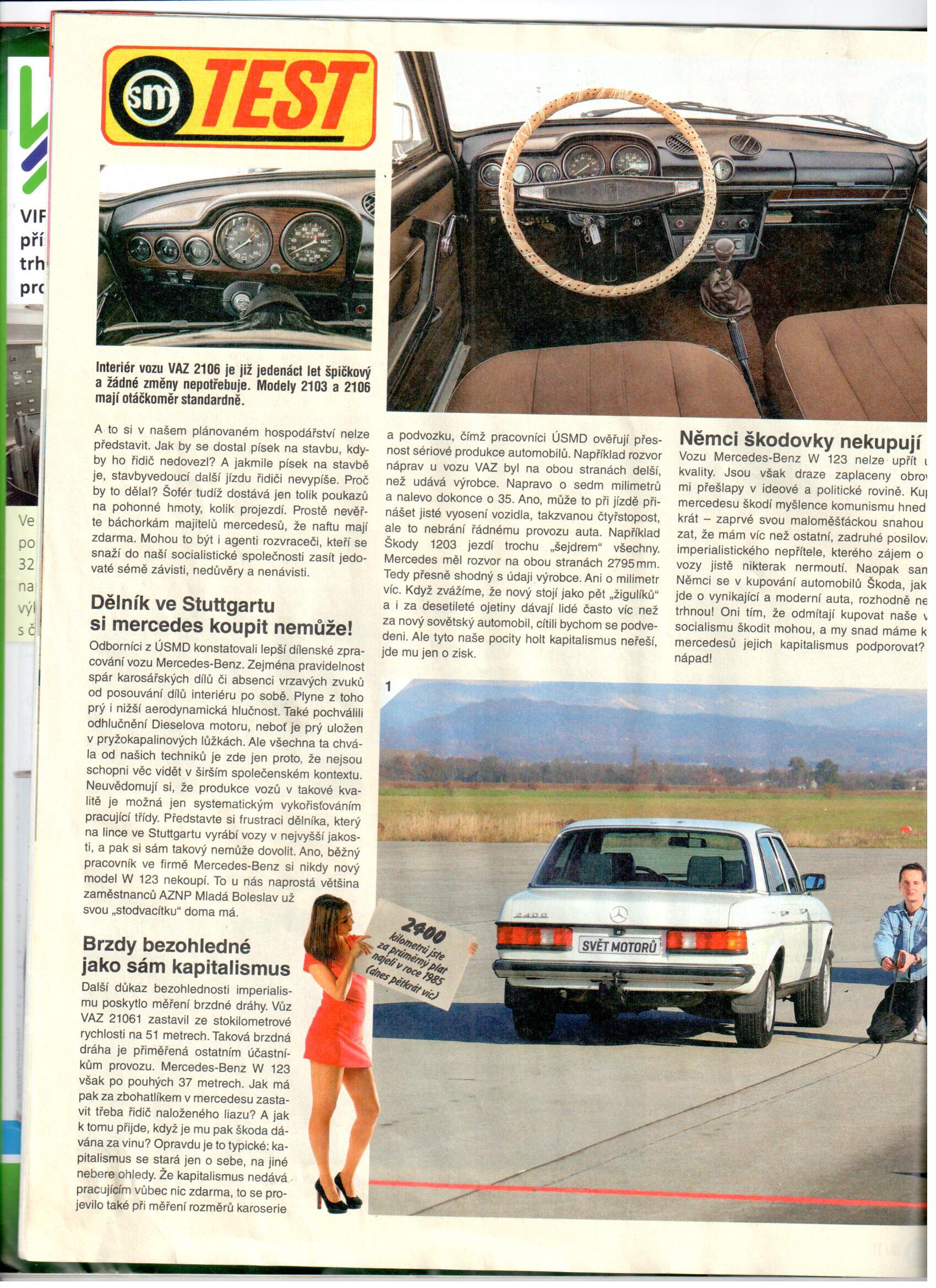 scan článku ze Světa motorů č. 51/2016 o srovnání Žigulíka a MB W123 (piano) připravovaného do tisku ve Světě motorů v r. 1984