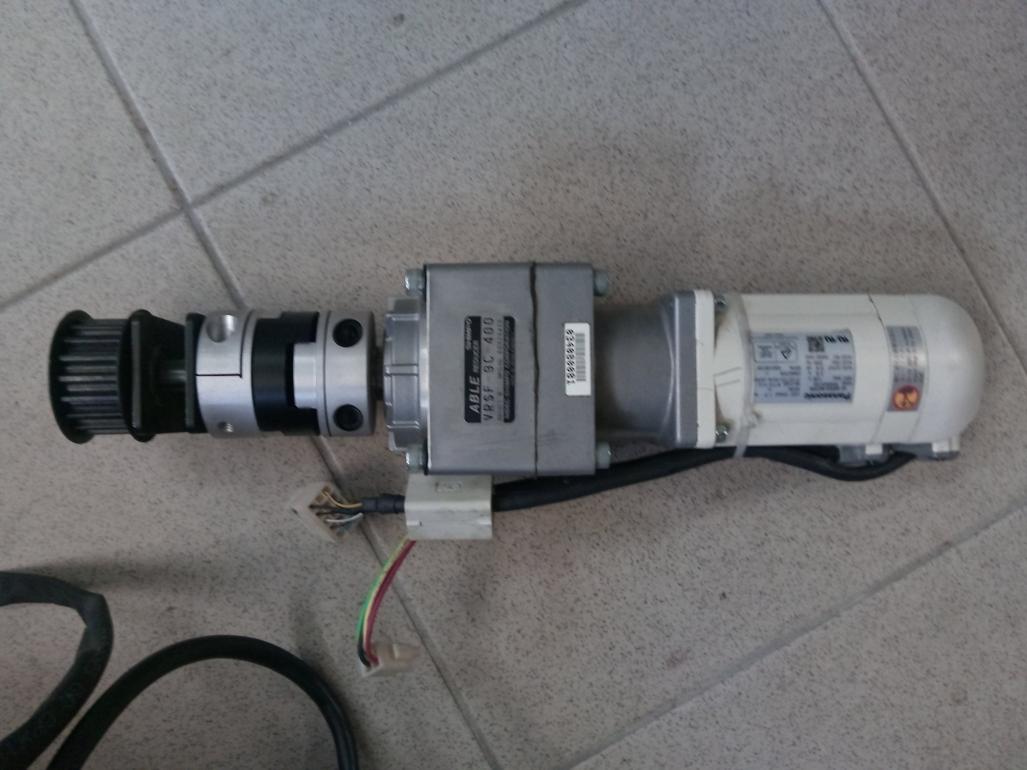 2) Servokomplet Panasonic: motor MSM042A1EE, driver: MSS043A1XP, převodovka VRSF-9C-400 (1:9 do pomala, zaručená vůle menší než 15 úhlových minut). Opět včetně kabelů k motoru, enkodéru (cca 2m) a řídicího kabelu s konektory. Součástí rekuperační tlumivka. Za převodovkou je ještě axiální spojka a výstupní hřídel s řemenicí, vše na drážku a pero - přenese velký krouticí moment.