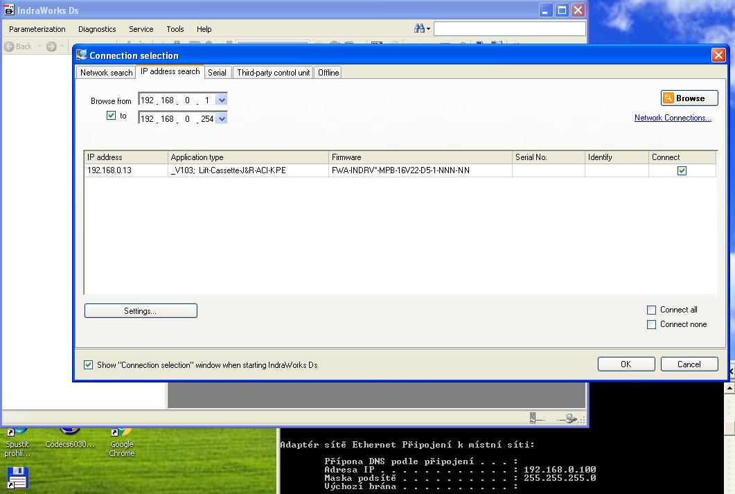 Když máme nastavený počítač je potřeba nastavit i driver. Takže pomoci čudlíků na panelu nastavíme komunikaci na ethernet a potvrdíme enter. Dal je nutné nastavit i adresu na které bude běhat. já měl tuším 192.168.0.14. ale indraworks umí projet cely céčkový rozsah, takze netřeba měnit pokud tam máte něco podobného v kontextu 192.168.0.X
