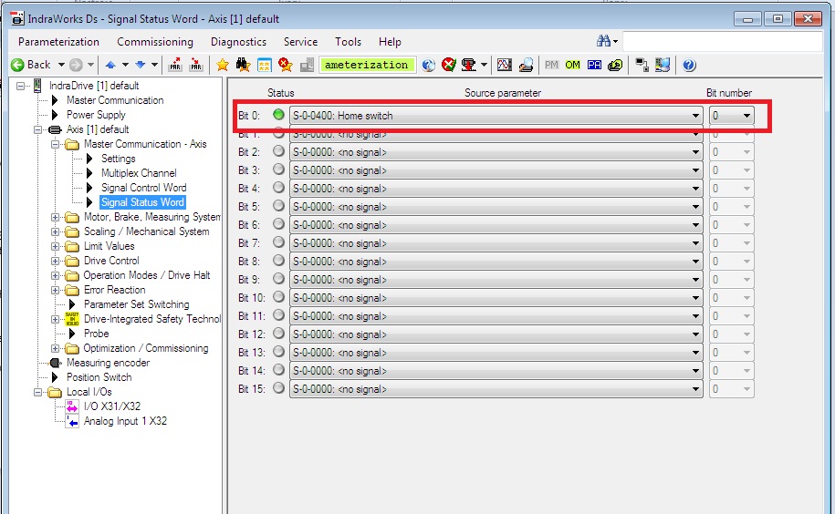 Jako druhy krok je zapotřebí nejak informaci o sepnutem spinaci poslat do řídícího systemu a k tomu můžeme použít Signal status word a nastavit na bit 0 informaci o home switch.