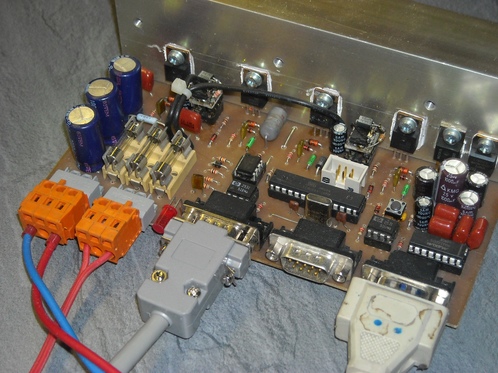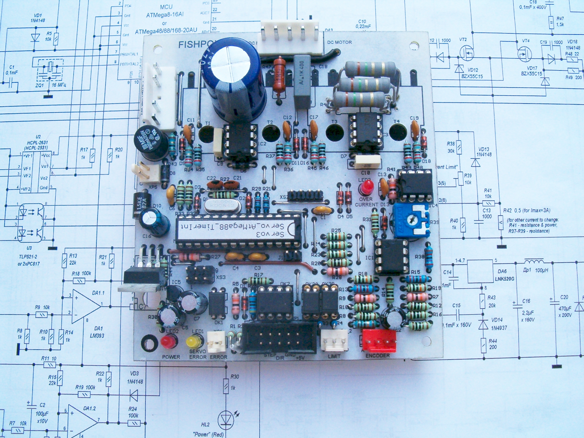 Tak tu je ten driver s ATmega8.Je to prototip .Momentalne pracujem na upravenej doske.Je tam aj zaber na made in home polomostik upravovany aby fungoval ako IR.Inac driver ide v pohode bez problemov.Co sa tyka napetia 5V pre logiku pouzijem obvod LM2576 impulzny znizujuci menic.Nepracuje v linearnom rezime takze sa nebude prehrievat.Riesenie pre tych co sa nechcu zabavat a kupovat drahe obvody treba pouzit externe mensie napatie pre napajanie logiky.