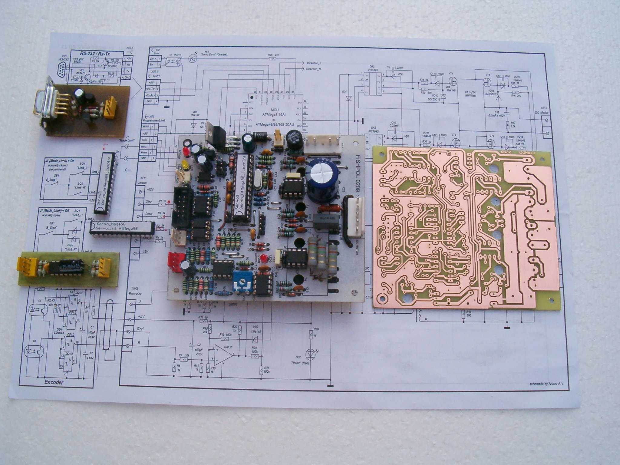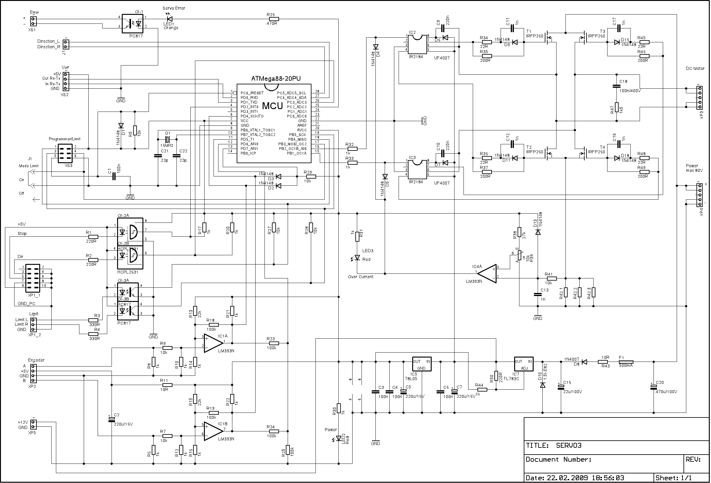 Keďže pred časom som postavil A300 , http://www.c-n-c.cz/viewtopic.php?t=1926&start=45 a objavil sa návod na stavbu servodrivera od"Arisov77 " , http://forum.rcdesign.ru/f41/thread40981.html , http://www.cnczone.com/forums/showthread.php?t=69640 , tak som sa rozhodol vyskúšať aj toto zapojenie . Navrhol som plošné spoje , vyrobil dosky , osadil a oživil . Po počiatočných ťažkostiach s nastavením , nakoniec všetko dobre dopadlo a môžem skonštatovať , že driver funguje . Je podstatne jednoduhší na výrobu ako A300 , čiže aj lacnejší . Nastavený je len na sucho , t.j. servomotor bez zariadenia , ale ďalšie nastavenie je už len potrebné urobiť so zariadením a s konkrétnym servomotorom .