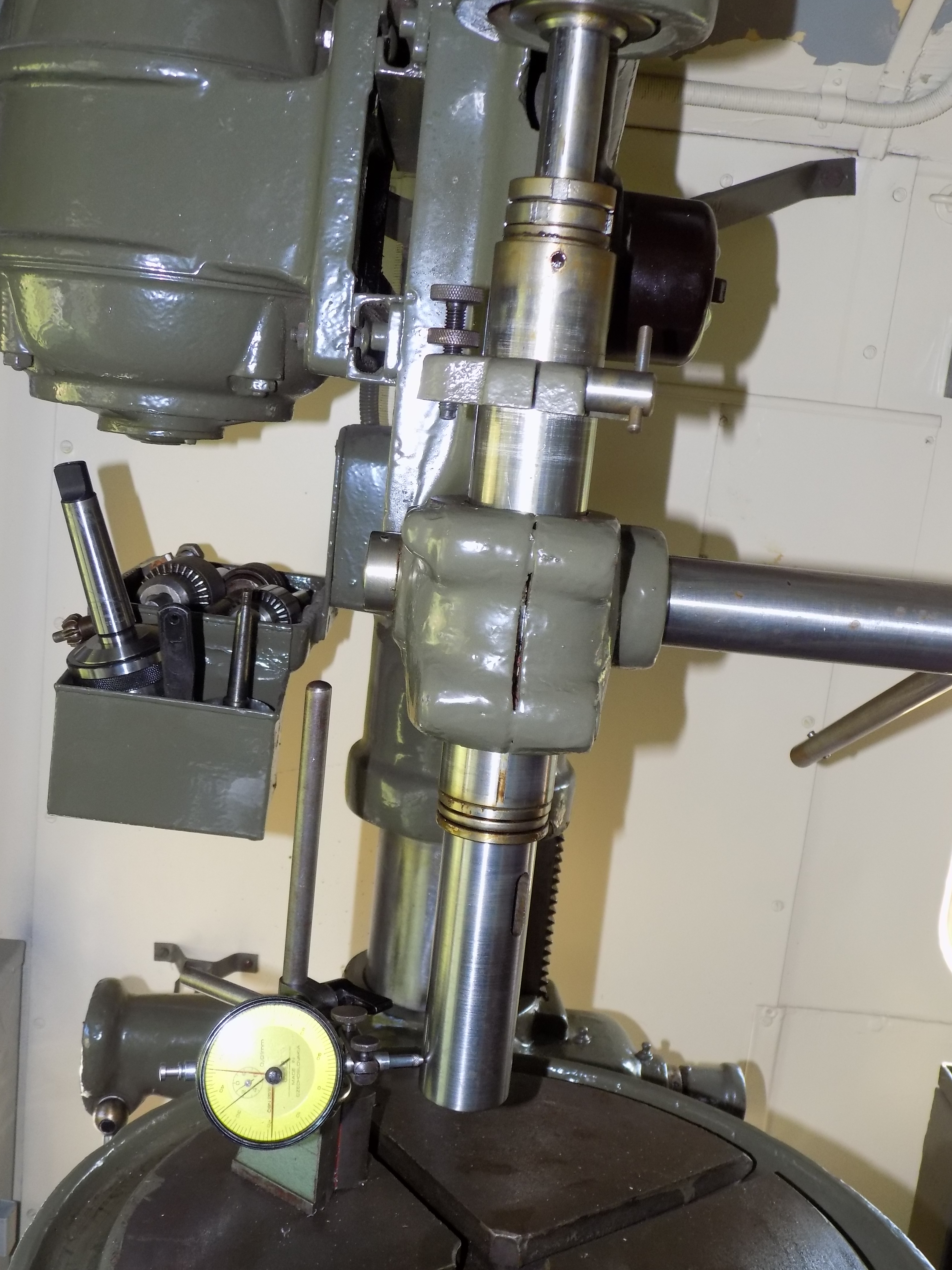 Po naražení sklíčidla do Mk3 - upozorňuji, že sklíčidlo i stopka je OK a na jiných mašinách běhá perfektně - a po spuštění stroje sklíčidlo i vřeteno hází. Srazil jsem sklíčidlo a přiložil hodinky na vřeteno - ručním otáčením řemenicí vřeteno hází cca 0,25 mm - což mi připadá dost. Je to v podstatě "kovářská" vrtačka, takže bych tuto nepřesnost i bral. Pokud však ji spustím na motor - cca max. 710 (1/min), tak se vřeteno natolik rozkmitá, že odhaduji výchylku na cca 1 mm (na takový kule se holt hodinky nepřikládají