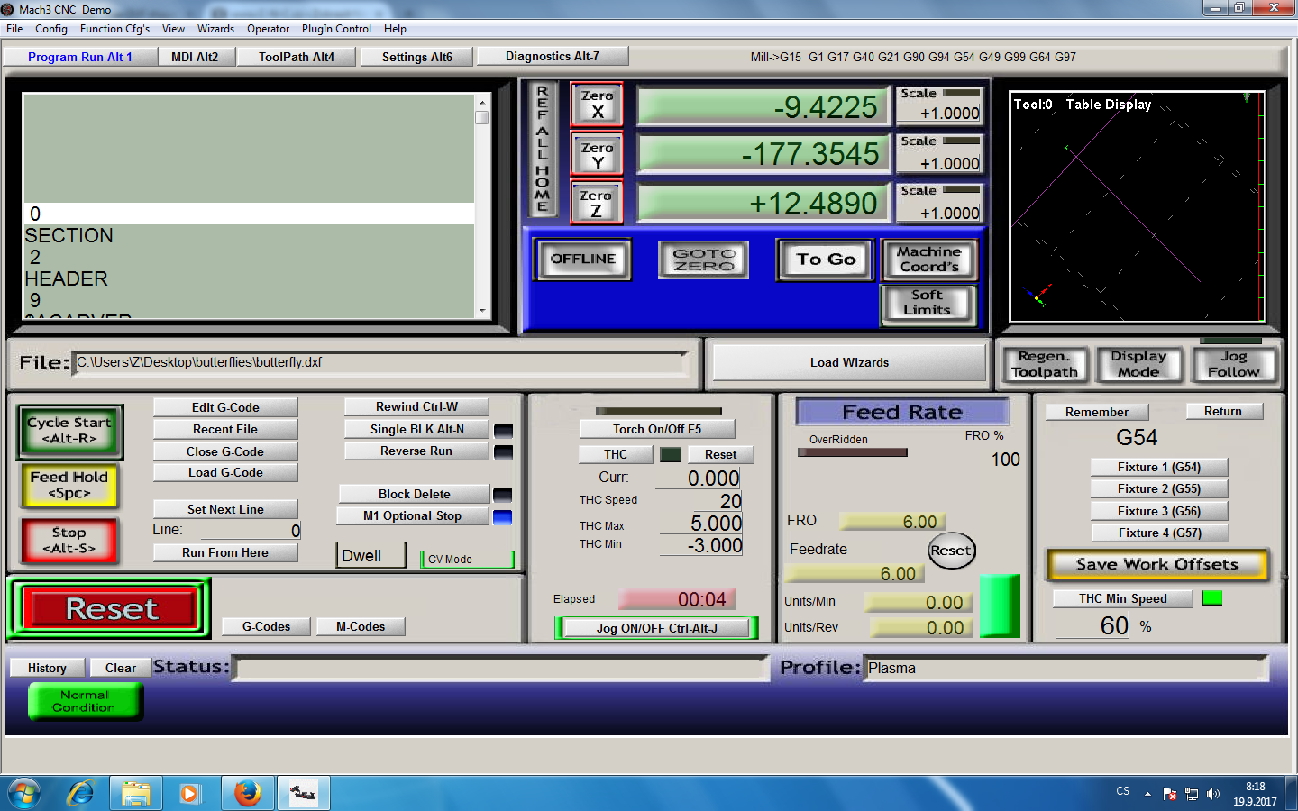 Zdravím, mám problém z mach3 demo když vložím dxf do machu tak mi to načte program, ale na Tool 0:Table display se načte krichle a zobrazuje osu X,Y,Z a program nejde zahajit.
