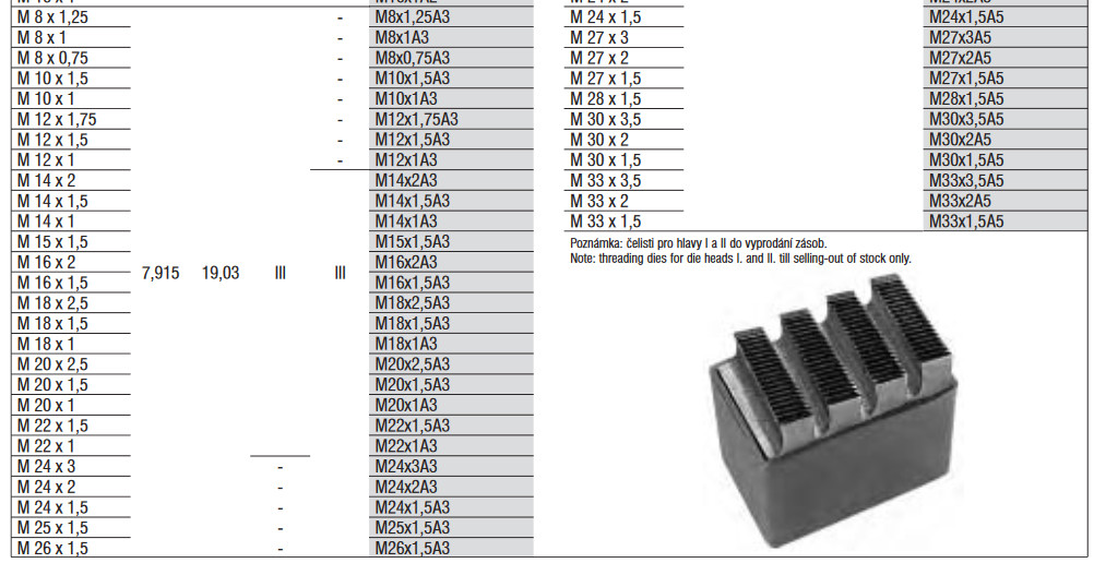 Dostala se mi do rukou automatická závitová hlava, ZHA I a mám i ZHA II. Dostal jsem k tomu i nějaké závitové čelisti (radiální čelisti). A tady mi to trochu zamotalo hlavu. Téměř vůbec mi není jasné značení čelistí. Našel jsem jen nějaké základní rozdělení podle úhlů broušení a tím pádem doporučenému použití (na jaký materiál) ... Ale zjistil jsem, že většina čelistí, které mám, má úplně jiné značení, než je obvyklé. A tak se chci zeptat, jestli by někdo z vás neměl nějaký podrobnější návod na použití hlav (což je vcelku jasné), ale hlavně tedy nějaký přehled značení (rozdělení) radiálních čelistí ?