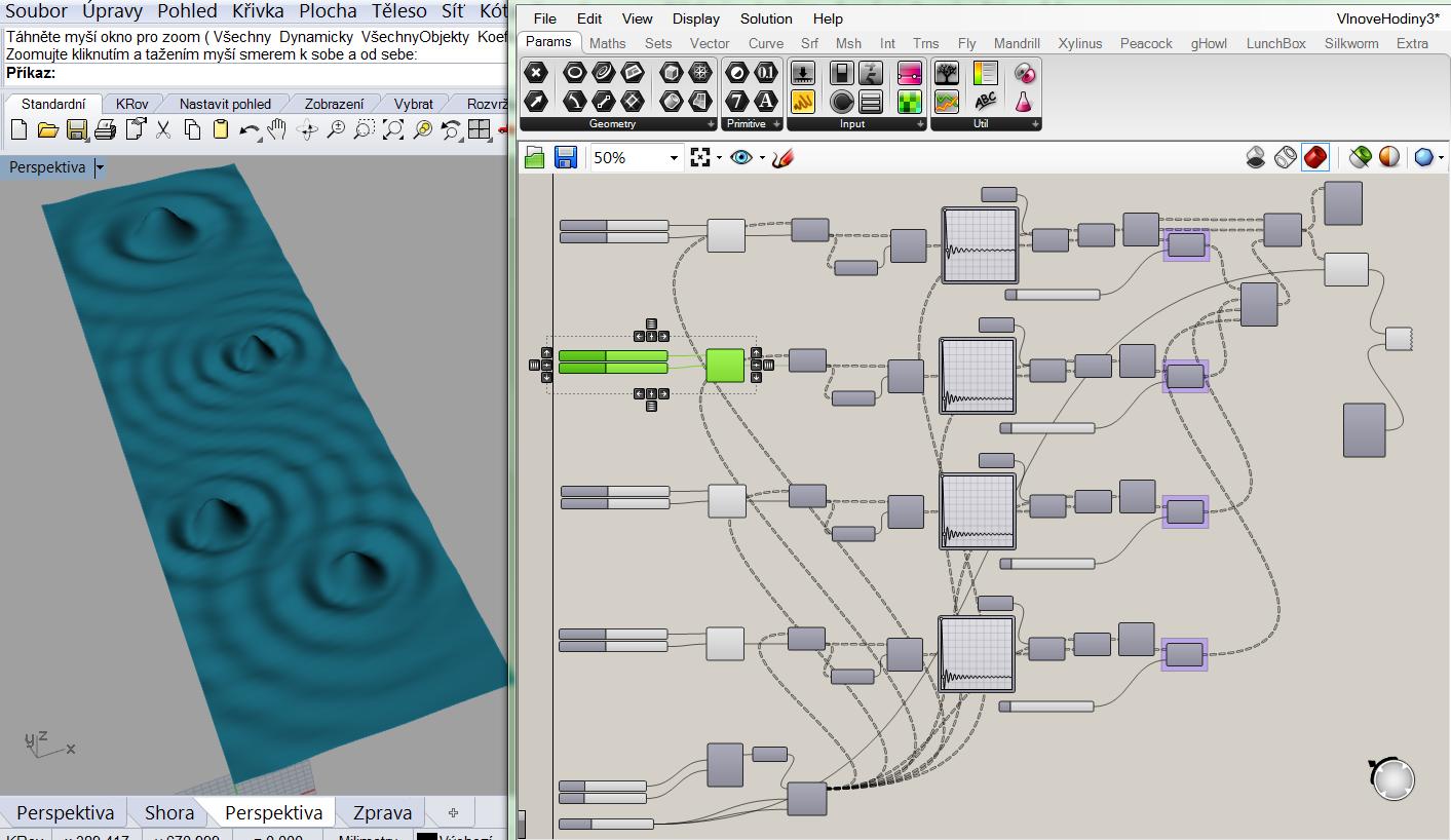 filla: Na reálné hladině asi tak nějak, ale nemusím se držet skutečných vln. Spíš bych to celé potřeboval parametrické, abych to pak těma posuvníkama dostal do nějaké esteticky hodnotné formy. Má to být na 3D interiérovou plastiku, kde jde spíš o výsledný dojem, než o přesnost. Takže si lámu hlavou nad tou rovnicí, která by mi s tím umožnila víc manipulovat. Netlumená sinusovka není použitelná.