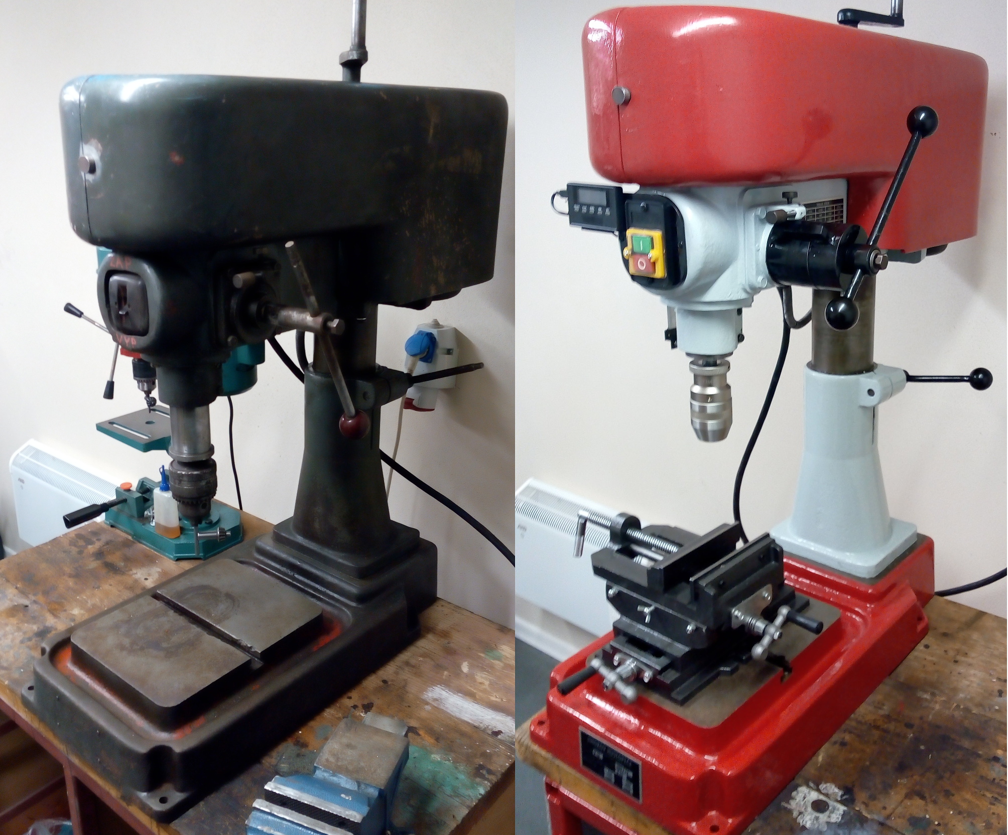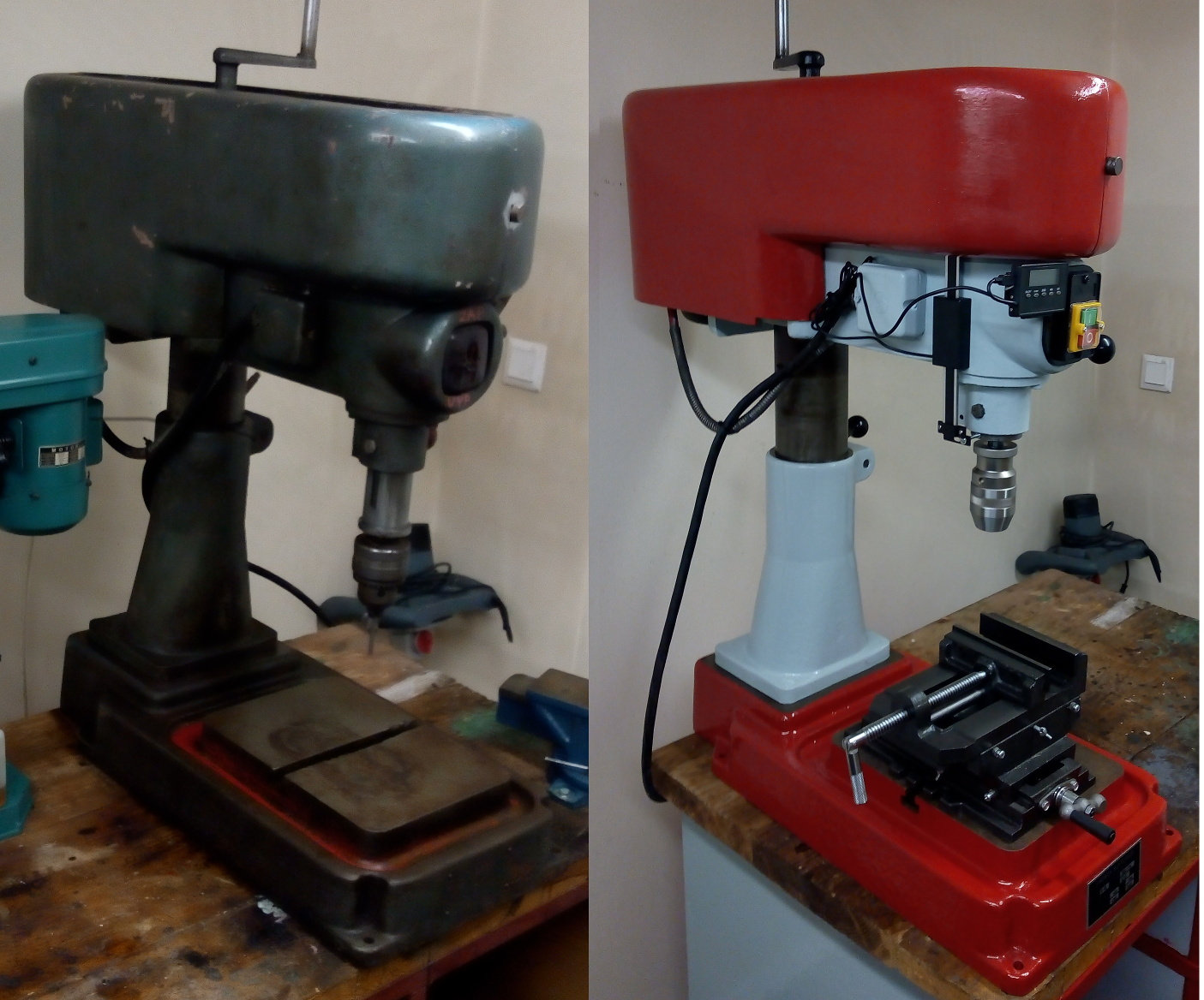 Když to máš takhle čistý,tak vezmi stříkací kyt(ne plnič ani nic jiného) a jak to je nastříkej jednu silnou vrstvu.Dá se ho nalít docela vrstva,ale kdybys měl furt málo,tak to nech zavadnout(tak dvě hodiny) a dej ještě jednu. Pak to nech někde v teple týden vyschnout (děsně to smrdí) a obruš to excentrem tak 240,kde se nedostaneš,stačí šmirgl na prst..Pak to polej jednou nebo půldruhou vrstvou polyuretanu a uvidíš ty zázraky.Když to budeš stříkat kladívkovou,jako to bylo původně,tak stačí bohatě jedna vrstva kytu a nemusíš ani moc brousit-ta barva toho dost schová.Na celou vrtačku stačí kilo kytu,nějaký ředidlo a ta kladívková se prodává tuším 0,8 kg plus tvrdidlo a ředidlo(to je speciál),normální polyuretan stačí bohatě 0,5kg plus tvrdidlo a ředidlo(to může být acetonové,stejně jako do kytu).Další možnost je,udělat tomu vzhled,jako mají dnešní nové mašiny: to zanmenáaž to bude nastříkaný do leskla,počkáš až polyuretan zavadne(podle teploty hodinu až půl dne) a zbytkem barvy,kterou si necháš v pistoli od toho stříkání ,to poprášíš. (chce to ubrat tlak na pistoli a přidat množství barvy-ona už bude po té době houstnout-udělá to větší kapičky a bude..)Po nastříkání už se to nezmění,když zatvrdne,tak máš vzhled jako na nových mašinách.Má to jednu výhodu-nemusíš pod to kytovat,skoro všechny vady to schová,proto to taky používají v generálkách.ALE: když se to zasviní(stačí zaschlej zoxidovanej olej,hodně špatně se to čistí .A mně se stejně nejvíc líbí hladká,lesklá,dobře vykytovaná mašina!