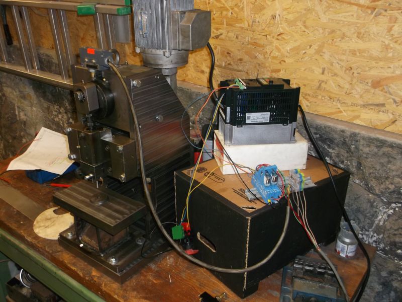 dorobené držiaky nástrojov, zatiaľ nie sú ideálne, ale fungujú. Chýba ešte pridržiavač a kryty. držiak nástroja musím ešte doladiť, je naklonený cca 0,05mm na 25mm chodu. možno je šikmá vrchná plocha. vrchný nástroj zatiaľ zaistený červíkom, možno aj on je príčina vychýlenia strižníku. Pohľad na "riadiacu elektroniku". ešte som musel doplniť kondenzátor na cievku Re2, aby sa mi systém nezakmitával (v určitej polohe). ostáva učesať elektriku do skrinky a dorobiť drobnosti.