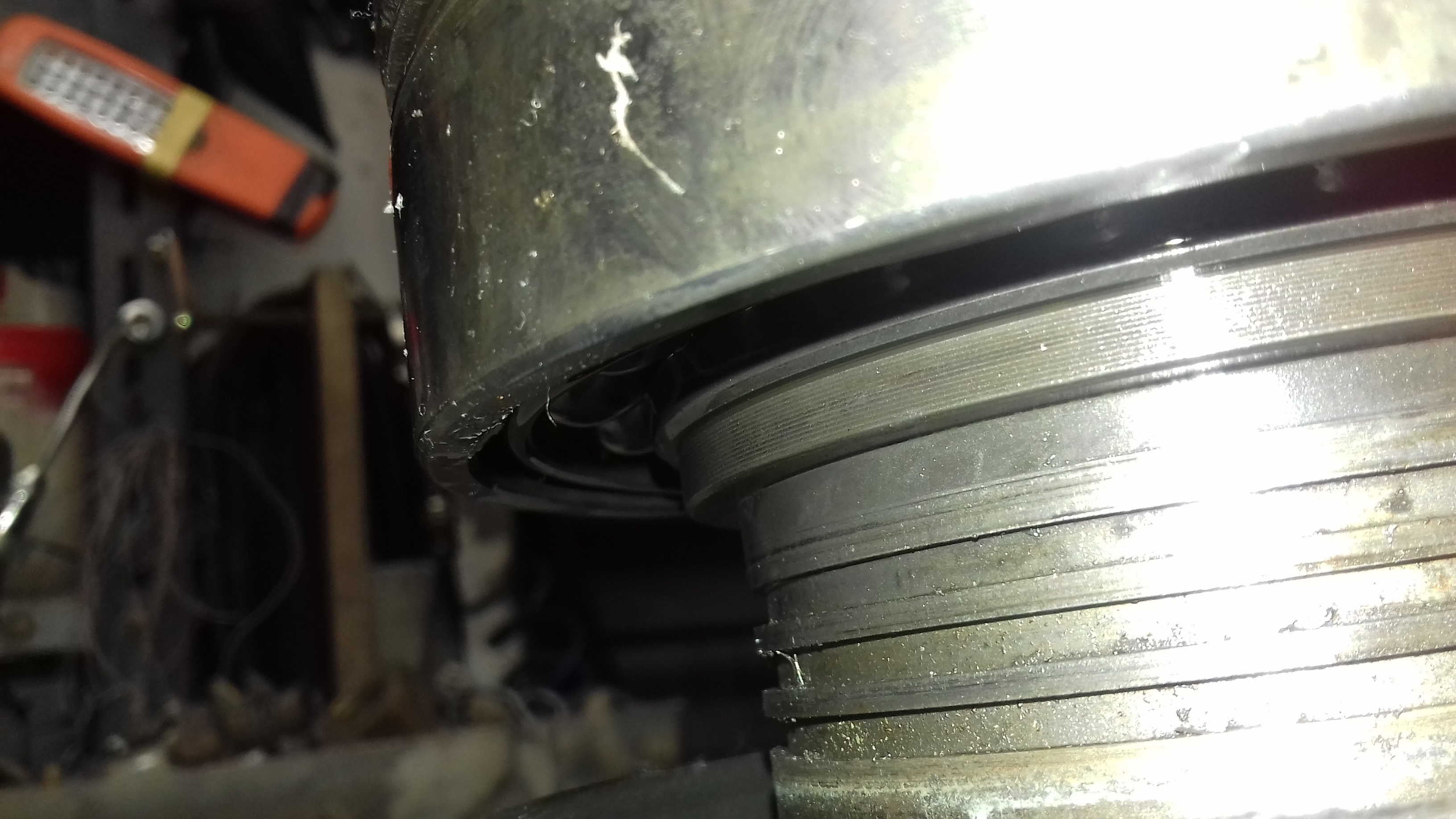 Problém č.2 je vôľa a hádzavosť vretena. Vôľa bola cca 0,05mm, po dotiahnutí zadnej matice (zelený kruh) bola 0,01mm. Nezdá sa mi to ako správny spôsob nastavenia vôle. Tu niekde som čítal že sa to robí hrúbkou vymedzovacej podložky medzi prednými ložiskami. Je to tak? Predpokladám, že prednou maticou sa len zaisťujú ozubenia. Tiež ma trápi hádzavosť vretena 0,06mm. Dúfam že to bude primárne od ložísk a výmena pomôže. Zatiaľ som to nerozobral aby som zmeral samotné vreteno.