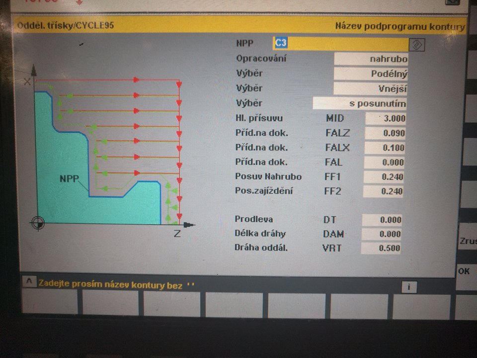 Ahoj . Cyklus95 je na hrubovanie/hladenie . Vytvoris si podprogram SPF (konturu) s nazvom napriklad C3 . ( musi byt ukonceny M17 ) . Navolis ho do NC pamäti . V hlavnom programe MPF si navolis cyklus 95(1 obrazok) a do prveho riadku (NPP) napises C3 . Druhy riadok ( opracovanie ) zmenis tlacidlom select na nacisto .(2 obrazok). Vyberies si smer obrabania a vypnis celu tabulku . Hotovo