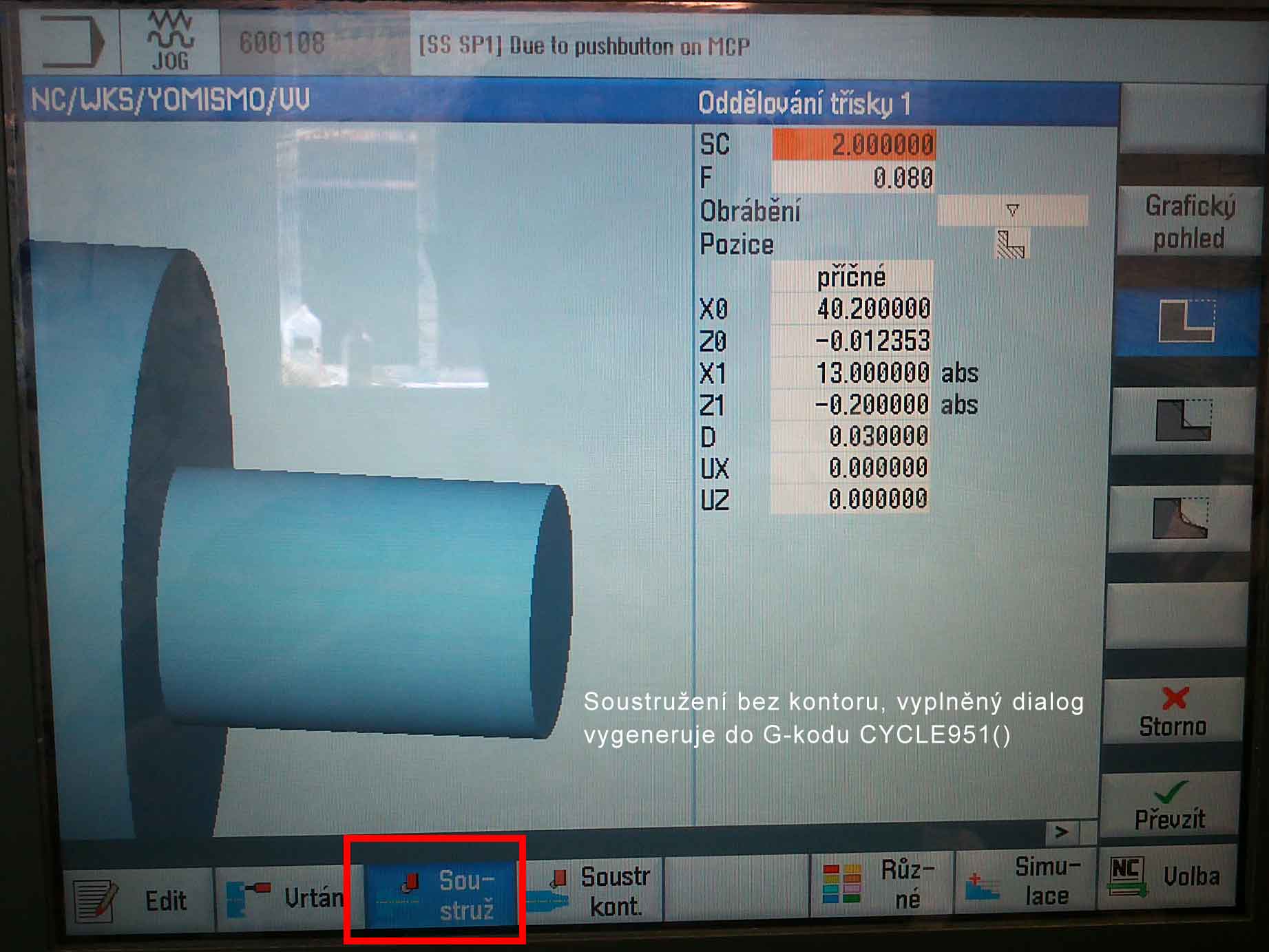 SINUMERIK pouzivame s dialogem, jsou tu dve skupiny soustruzeni, s a bez kontory. Primo pres dialog vyvolat cyklus CYCLE95 nejde, ale pokud jej napisi do G-kodu rucne tak se sam zmeni na dialog a lze ho upravovat. Misto nej je tu CYCLE951.