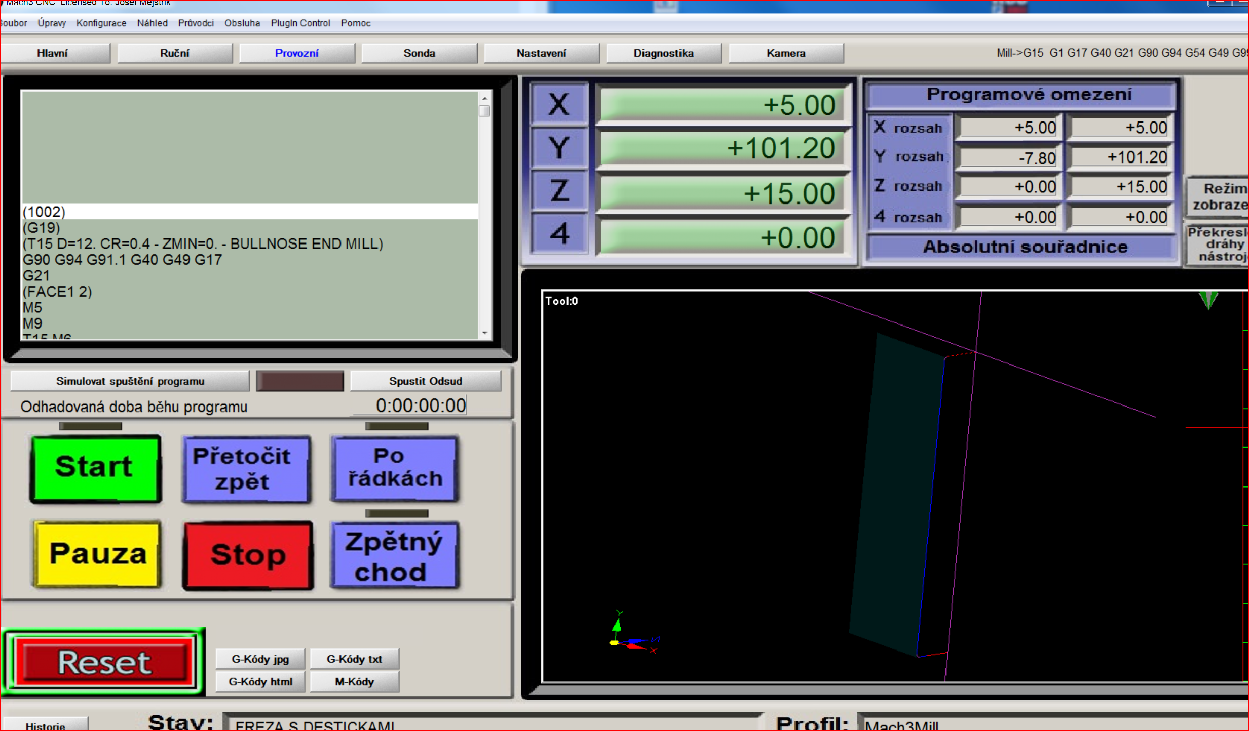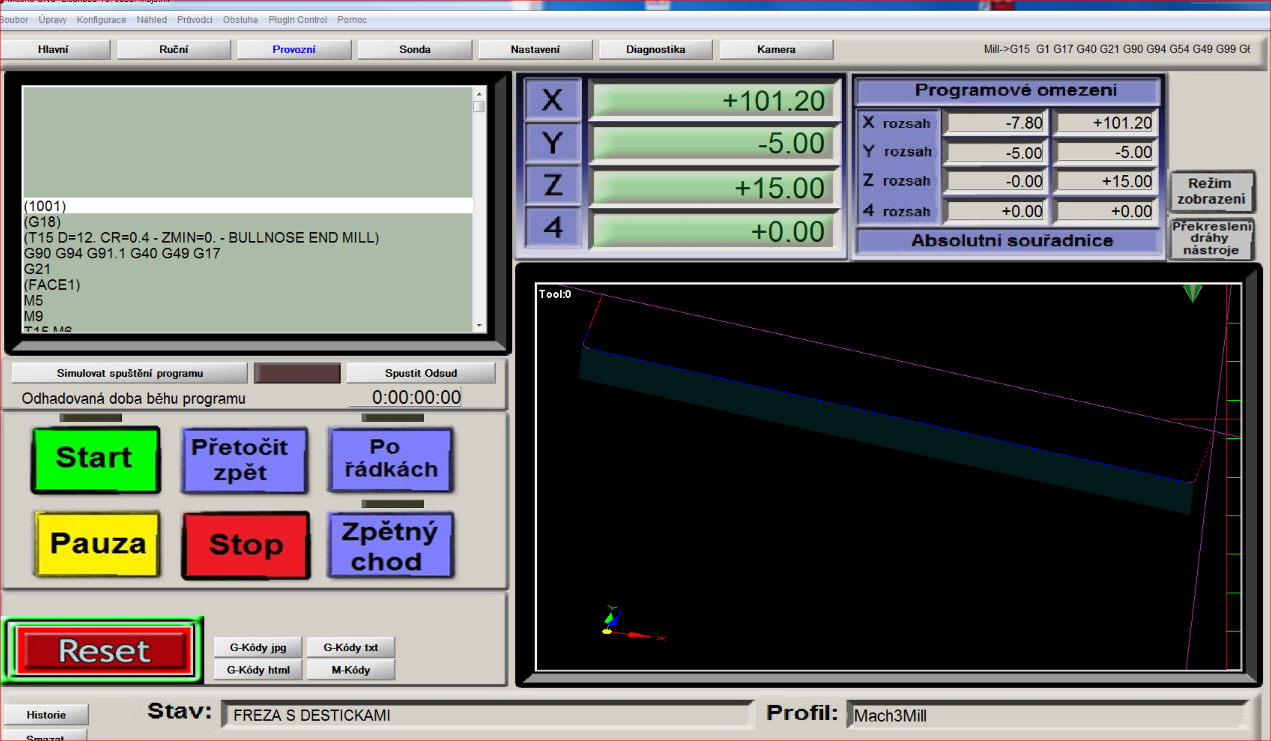 narazil jsem na podobný problém - v mém případě jsem jednoduchý program psal ručně (přesněji konvertoval z programu v rovině XY). Nedokázal jsem svou představivostí pochopit kde má být oblouk G2 a kde G3. Nakonec po mnoha variantách to dopadlo a program běžel - jen jsem zjistil, že Mach v náhledu zobrazuje správně i variantu, která pak při běhu dělá oblouk na druhou stranu. V náhledu - po spuštění ale dráhy překresloval jak skutečně pojede.