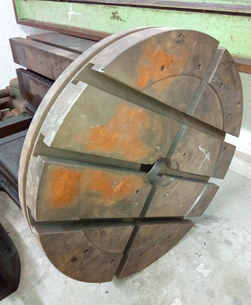 Když jsem o tom přemejšlel vic, napadlo mě, že by tam mohl bejt otočnej stůl, protože křížovej posuv by byl řešenej na vrchu, a tak jsem znova zajel do šmelcu a dovezl si hotovej stolek z padesátky stolu, bude chtít trochu srovnat do roviny, je to nějakej atyp, ale je novej a to se cení. Takže jej zapustím do desky stolu, a mohlo by se na něj upinat výklopný zařízení na fixaci hlav, takže by to byl pěknej 5ti osej stolek, kterej by mohl vážít půl tuny, otázka je, jestli to ruční přesouvání neudělat strojně, ale to už vlastně stavím cnc frézku, a to nepotřebuju