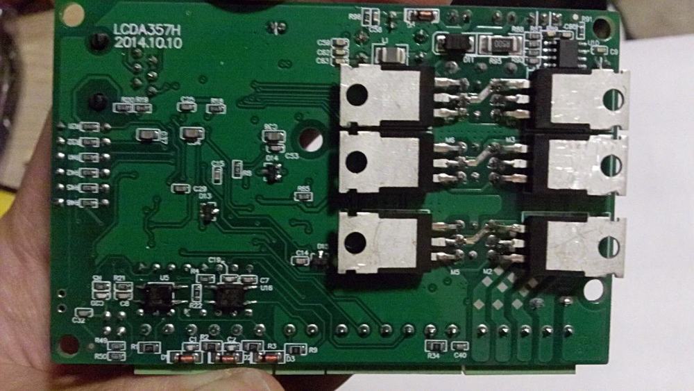 Ty fety jsou sice o tu lepicí gumu pouze opřené, ale celé to je stažené těma šroubama přes desku - takže co se týče chlazení fetů, no problém (celkem). Rvát se mi to dolu moc nechce. Optrony jsou 6N137 (2ks), všechny hlavní io mají sundaný (odpálený) popis (aby nebylo vidět co to je).