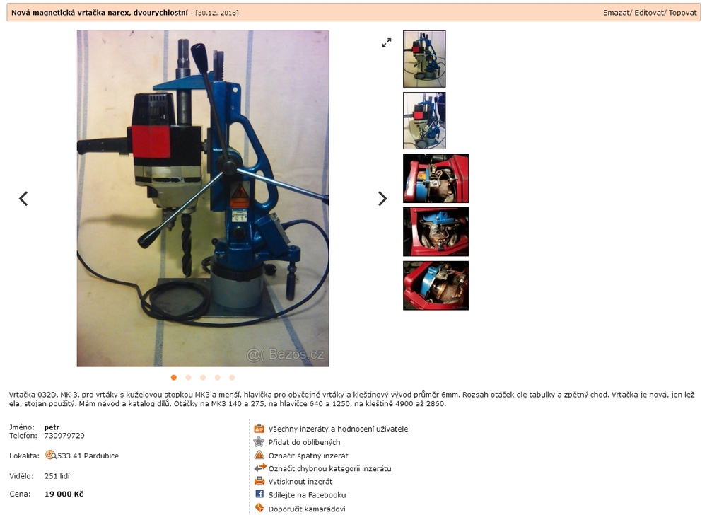 Ale pokud by se Ti poštěstilo koupit výhodně samotný magnetický stojan (Magnetor) dbej hlavně na jeho mechanický stav. Elektriku vůbec nemusíš řešit i kdyby byl spálený elektromagnet, není problém ho opravit. Já osobně jsem minimálně 3 kusy elektromagnetů převíjel a to je už cca 15 roků a fungují dodnes. Pokud se jedná o samotnou vrtačku EV 032D, není to špatná mašinka, já sám ji taky mám, ale nemám magnetický stojan, ale origo "stolní" stojan.