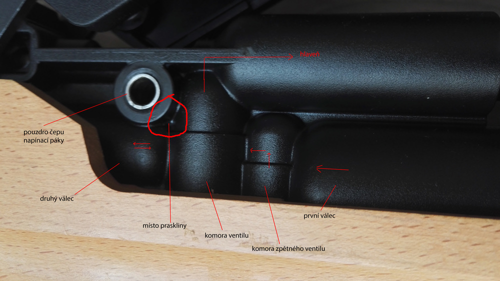 jde o starší závodní pca vzduchovku, která je z velké části plastu. Krátký popis: prvním pohybem páky se přepouští vzduch z prvního válce přes zpětný ventil do komory ventilu a odtud do druhého menšího válce. Druhým pohybem páky (zpět) se přepouští vzduch z druhého válce zpět do komory ventilu kde se stlačí na cca 65bar a přitom se krátkodobě ohřeje na cca 600 stupňů. A tady vzniká problém - vysoká teplota, tlak, síla od čepu páky po čase způsobuje, že v nejslabším místě dojde trhlině a při stlačení začne vzduch unikat.