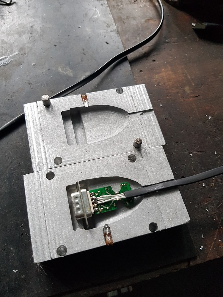 šlo by udělat jen vložky formy v podstat ě dvě duralové plotny do našeho rámu...pokud by chtěl stejné provední jak je na foto, bylo by vhodně udělat vyjímatelnou vložku, která by se šroubovala přímo na D-sub konektor a spolu by se založila do formy. Vložek několik, aby se to během cyklu stihlo přešroubovat. a vznikla by tam ta dosedací těsnící plocha, zároveň by se vyřešila fixace konektoru a dps