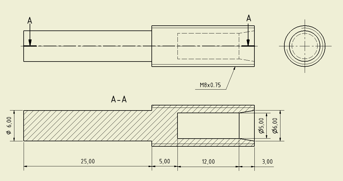 Nejsem strojař, takže jsem "cosi" namaloval a popíšu to raději slovně. Vnější průměr 6 přijde zasunout do Kress kleštiny. Do vniřního průměru 5 s rozšířením na konci přijde malá kleština. Přes závit M8*.75 přijde převlečná matka, závit stačí v min. délce 15. Samozřejmě je žádoucí souosost válcových ploch a závitu. V oblasti kóty 5 jde jen o propojení obou částí, takže lze mírně modifikovat sražením hran apod.