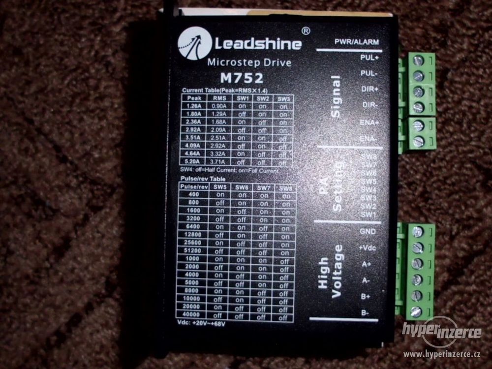 Dále prodám 1ks driver M752 - driver pro 2-fázové krokové motory, 75V, 5.2A. -Napájecí napětí do +75VDC, špičkový proud do 5,2A -Nastavení proudu fáze od 1,26 do 5,2A (8 hodnot) -16 volitelných rozlišení kroku až do 51200 kroků/ot -Maximální vstupní frekvence 300 KHz -Opticky izolované vstupní signály -Vhodný pro 2-fázové a 4-fázové krokové motory -Ochrana proti zkratu na výstupu, podpětí a přepětí napájecího napětí -Automatická redukce proudu po zastavení motoru.