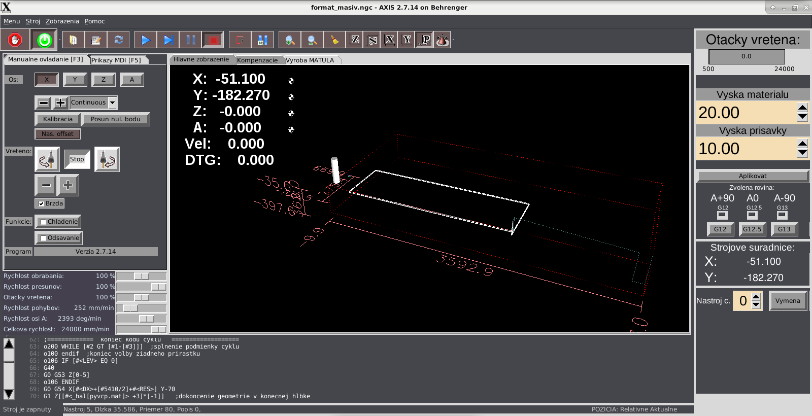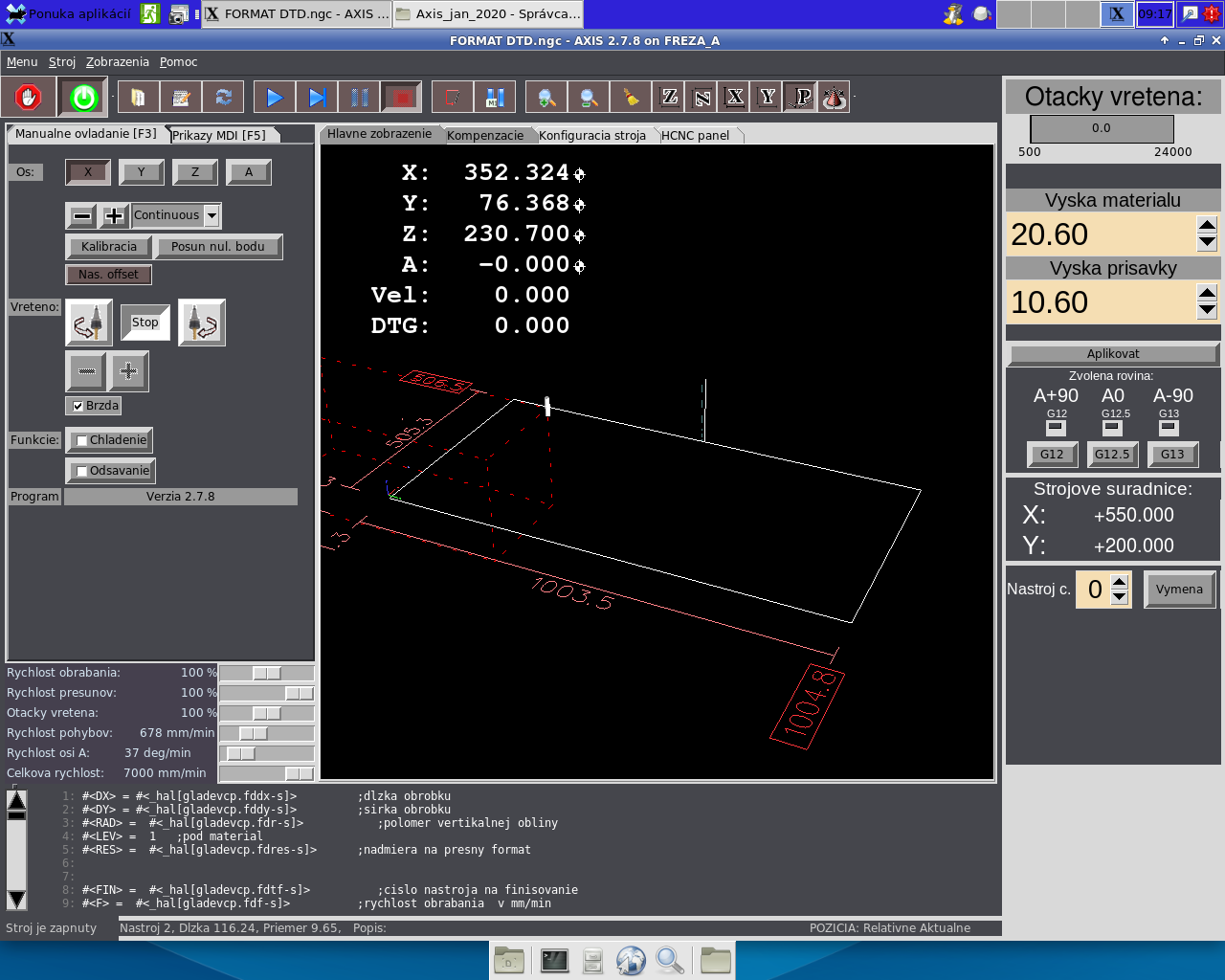 Ahojte. Ešte to tu žije? Dakujem velmi pekne za preklady. Ale potrebujem radu. Zamenil som nazvy chladenie a odsavanie na chladenie a hmla tak aby mi to pasovalo s fusion M kodmi. Skusil som vytvorit dalsie okienko v axis.tcl s nazvom lube ktore by som pouzil ako odsavanie. Neviem este ku akemu kodu je to pripísané ale to uz by som doriešil (možno). No problem je ze tlacidlo sa nevytvorí ale ak spustim linux a zapnem ho tak sa mi zopne 3tie rele automaticky. To by nebol problem zmenit z True na False ale aj tak nevidím to tlačidlo. Nejaky nápad? Ďakujem