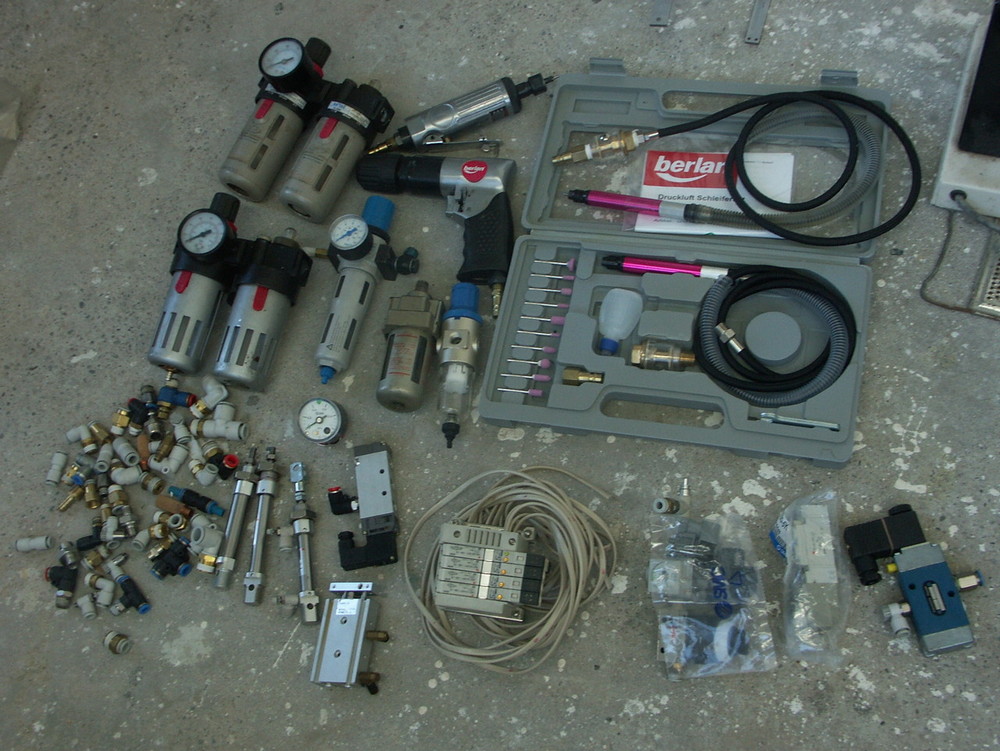 dvě pidifortunky a jedna větší, pneuvrtačka, odlučovače (maznice nefungují) ventily, pár miniválců a nějaký to pneumatický smetí.