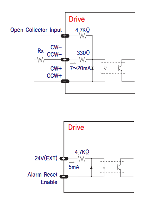 Driver je určen pro průmyslové použití a předpokládá se, že řídící signál bude mít 24V a na vstupy DIR a STEP se přidají přídavné odpory RX.