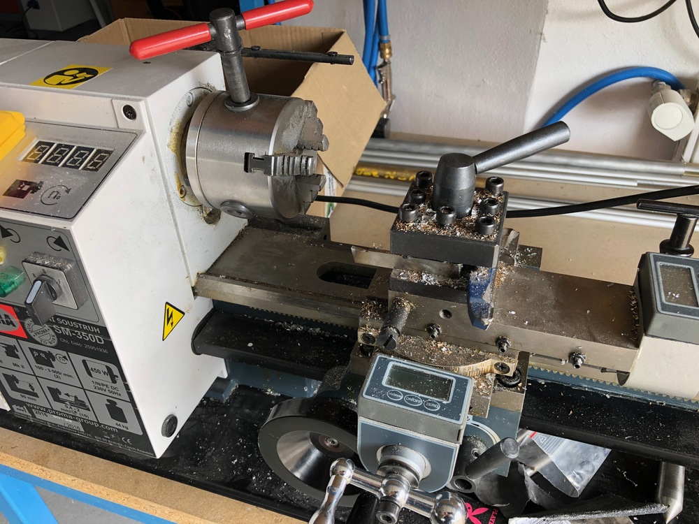 Asi 10x použitý a jako rozměrově nevyhovující jsem ho odložil. V původním stavu bez poškození /když se omete prach a šponky bez známek použití/. Druhé čelisti a další převody nikdy nepoužity a součástí. Soustruh koupený loni v zimě, tudíž stále v záruce (kopii dokladu by účetní našla a přidám)
