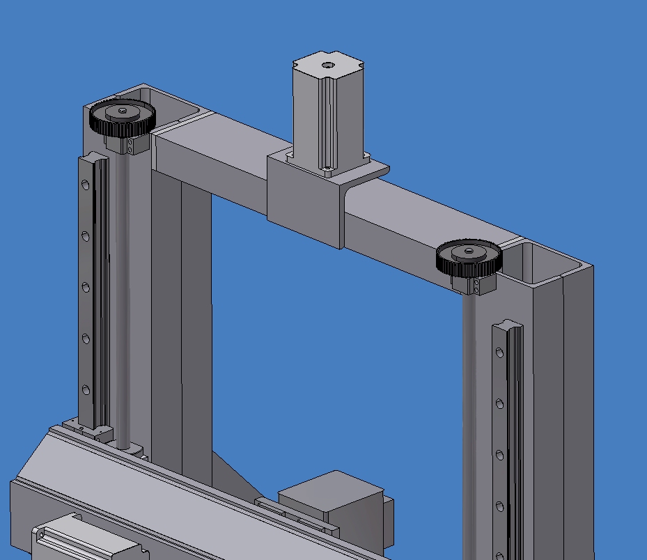 2/na každý sloup vedle lineáru dát jeden šroub s matici pevně ukotvenou k portálu a otáčející se šroub by měl nahoře řemenici a obě řemenice spojeny řemenem přes řemenici serva... Tady mně zase děsí rozteč řemenic na sloupech cca 800mm
