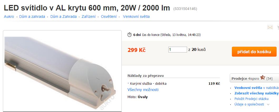 čau, osobně mám v dílně 6 kvalitních úsporek žárovek (dílna jen 4x4m), ekvivalenty 100 Watových klasik, půl na půl Denní světlo - bílá a Denní světlo - žlutá a nad mašinou úsporku s přikonem 200W!! to je jak slunko, ale pěkně difuzní, přemýšlím ještě na prosvětlení stinných míst ve stroji dát malé zářivky, našel jsem za pár kaček solidní i s krytem, tak přispeju do vlákna: http://aukro.cz/led-svitidlo-v-al-krytu ... 04146.html" onclick="window.open(this.href);return false; ... pořádné lumeny v dílně jsou základ, vše vystoupí a jdou vidět detaily i když se natáčí video, je to 100 a 1