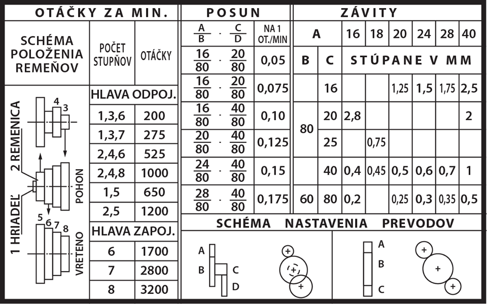 Vie mi niekto poradit, akym sposobom funguje na na ruskom sustruhu Universal TŠ-3 (Универсал ТШ-3) rezanie zavitov? Je k nemu takato tabulka, ktoru som ako-tak prelozil z rustiny. Mam na nom ozubene kolesa oznacene 80, 20, 16, ale nie som z toho nijako mudry. Ma niekto prosim skusenosti s tymto typom? Dakujem.