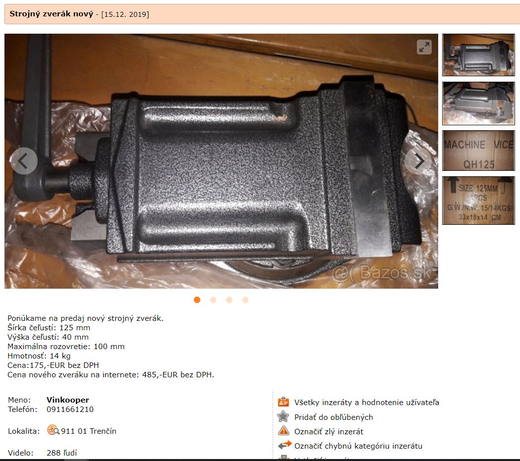 Raz zverák za 2 stovky, potom kúpiš na tom istom mieste trebárs novú cnc zrýchľovaciu hlavu aj s komplet klieštinami po dohode za 80 €. Tak som napísal, že s pánom je rozumná dohoda, ja som sa dohodol a nakúpil k svojej spokojnosti, dokonca dostal nejakých pár drobností "gratis". Ono pri bazáre je to tak, že každá vec má takú cenu, za akú ju niekto je ochotný kúpiť. Takže toľko k téme "dohoda".