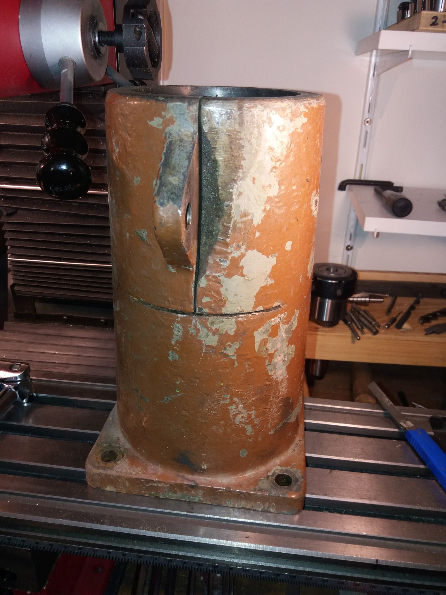 Jestli je vevnitř sloupu prázdno, tak si udělej druhý ucho podle prvního, a navrtej je a se sloupem sešroubuj třeba 4ma šroubárna durch plášť a mohlo by to stačit. To oko může mít širší základnu aby se to oko nemělo snahu vyvracet. Může mít i protikus vevnitř, aby se to pěkně stáhlo. Všechno uděláš na frézce.